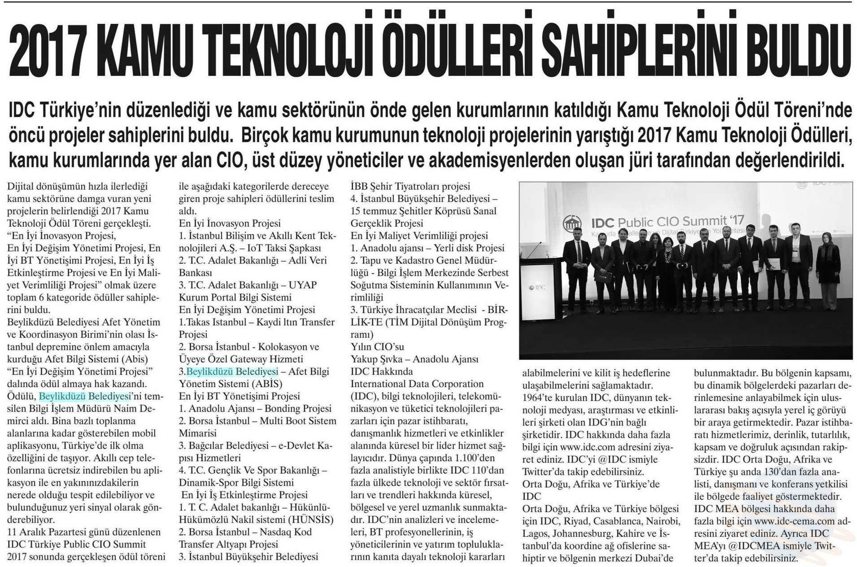 20 Aralık 2017 tarihli " BÜYÜKÇEKMECE" gazetesi. IDC Türkiye'nin düzenlediği ve kamu sektörünün önde gelen kurumlarının katıldığı Kamu Teknoloji Ödül Töreni'nde Beylikdüzü Belediyesi Afet Bilgi Yönetim Sistemi (ABİS) ile " En İyi Değişim Yönetim Projesi" dalında ödül almaya hak kazandı.