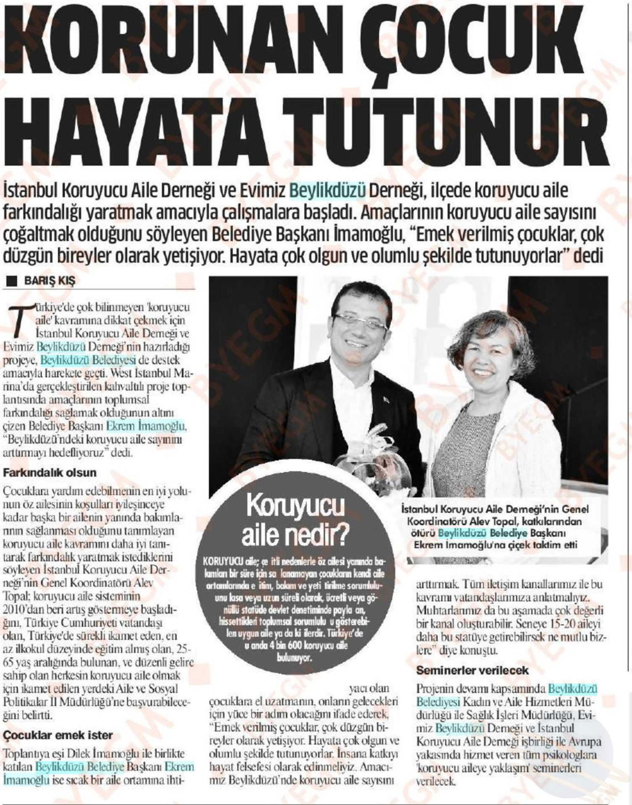 21 Aralık 2017 tarihli "DAMGA" gazetesi. İstanbul Koruyucu Aile Derneği ve Evimiz Beylikdüzü Derneği, ilçede koruyucu aile farkındalığı yaratmak amacıyla çalışmalara başladı. Amaçlarının koruyucu aile sayısını çoğaltmak olduğunu söyleyen Belediye Başkanı Ekrem İmamoğlu, "Emek verilmiş çocuklar, çok düzgün bireyler olarak yetişiyor. Hayata çok olgun ve olumlu şekilde tutunuyorlar" dedi.
