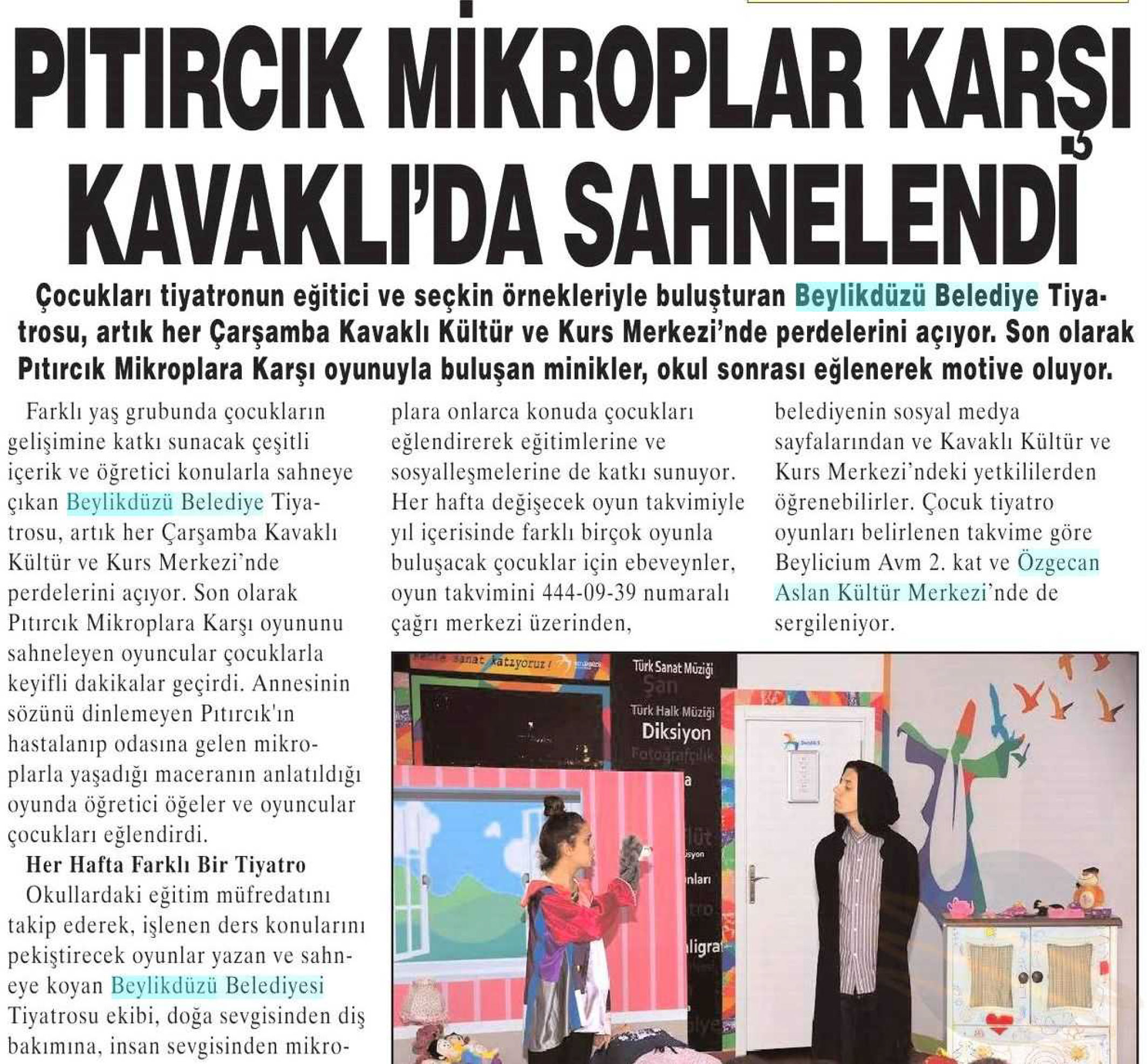 22 Aralık 2017 tarihli "YURT HABER" gazetesi. Çocukları tiyatronun eğitici ve seçkin örnekleriyle buluşturan Beylikdüzü Belediye Tiyatrosu artık her Çarşamba Kavaklı Kültür ve Kurs Merkezi'nde perdelerini açıyor.