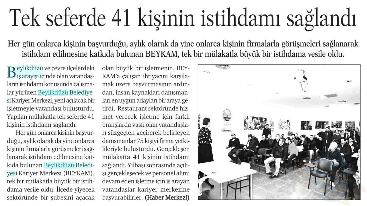 25 Aralık 2017 tarihli "HÜR SES" gazetesi.Her gün onlarca kişinin başvurduğu, aylık olarak da yine onlarca kişinin firmalarla görüşmeleri sağlanarak istihdam edilmesine katkıda bulunan BEYKAM, tek bir mülakatla büyük bir istihdama vesile oldu.
