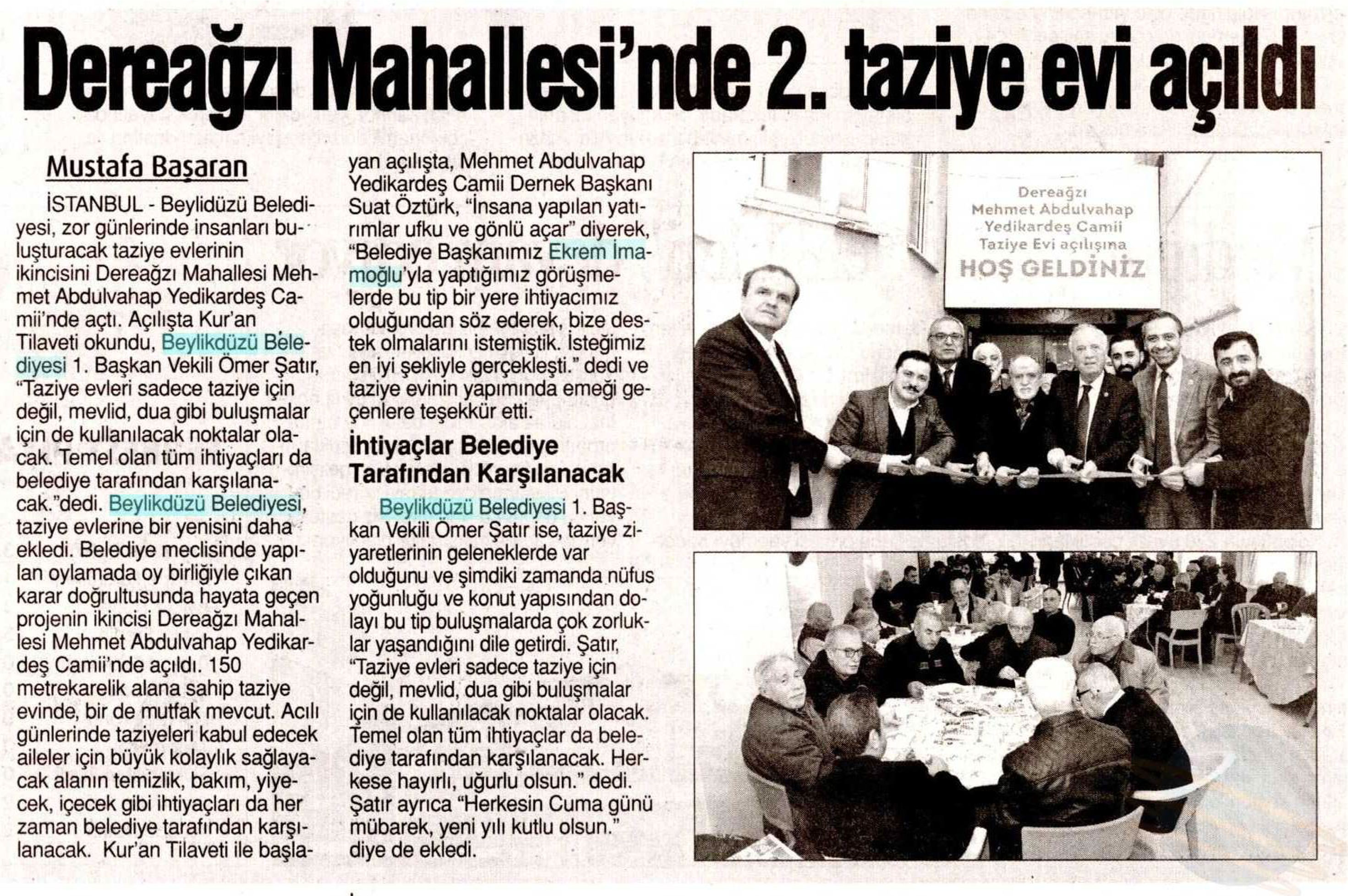 1 Ocak 2018 tarihli "YENİ ÇAĞRI" gazetesi. Beylikdüzü Belediyesi, zor günlerinde insanları buluşturucak taziye evlerinin ikincisini Dereağzı Mahallesi Mehmet Abdulvahap Yedikardeş Camii'nde açtı.