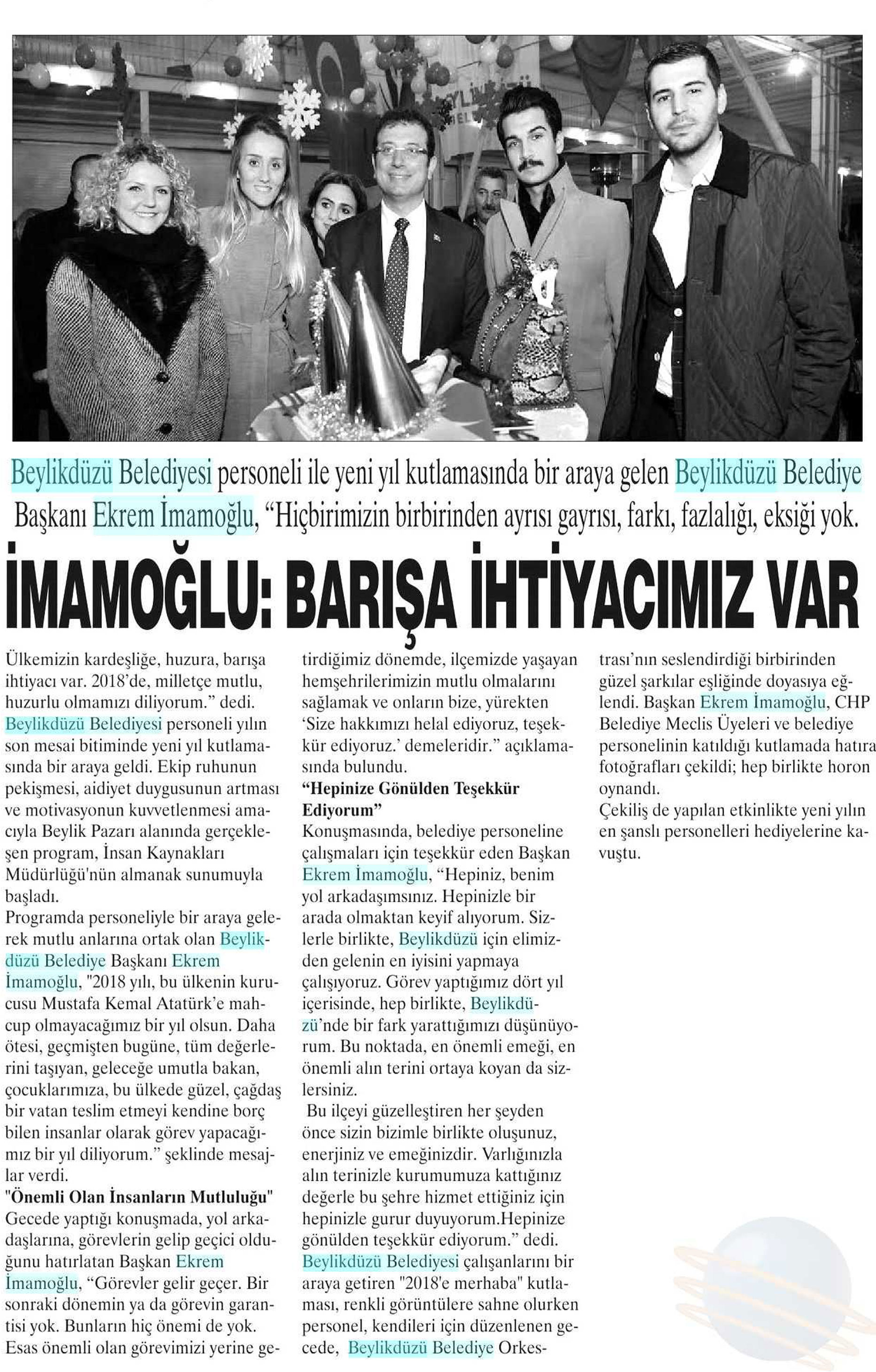 3 Ocak 2018 tarihli "YURT HABER" gazetesi. Beylikdüzü Belediyesi personeli ile yeni yıl kutlamasında bir araya gelen Beylikdüzü Belediye Başkanı Ekrem İmamoğlu, "Hiçbirimizin birbirinden ayrısı gayrısı, farkı, fazlalığı, eksiği yok.