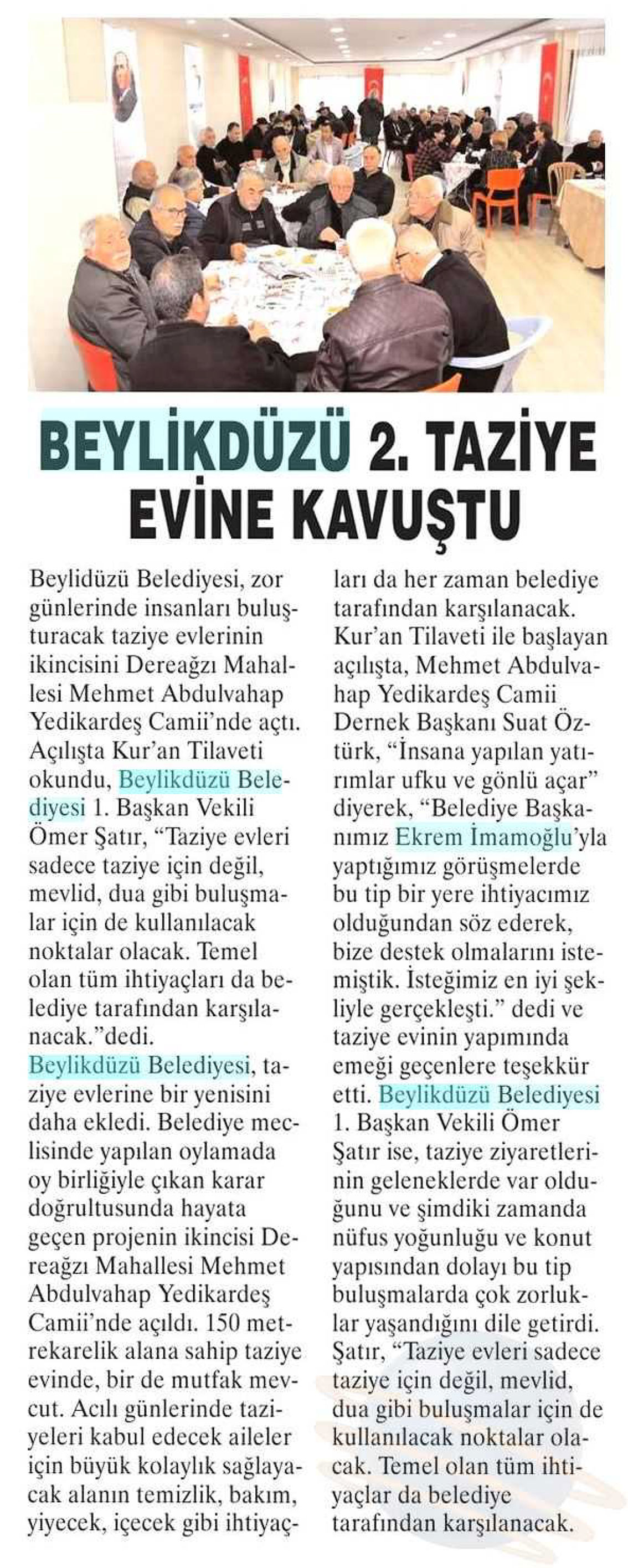 3 Ocak 2018 tarihli "BÜYÜKÇEKMECE" gazetesi. Beylikdüzü Belediyesi, zor günlerinde insanları buluşturacak taziye evlerinin ikincisini Dereağzı Mahallesi Mehmet Abdulvahap Yedikardeş Camii'nde açtı. Açılışta Kur'an Tilaveti okundu.