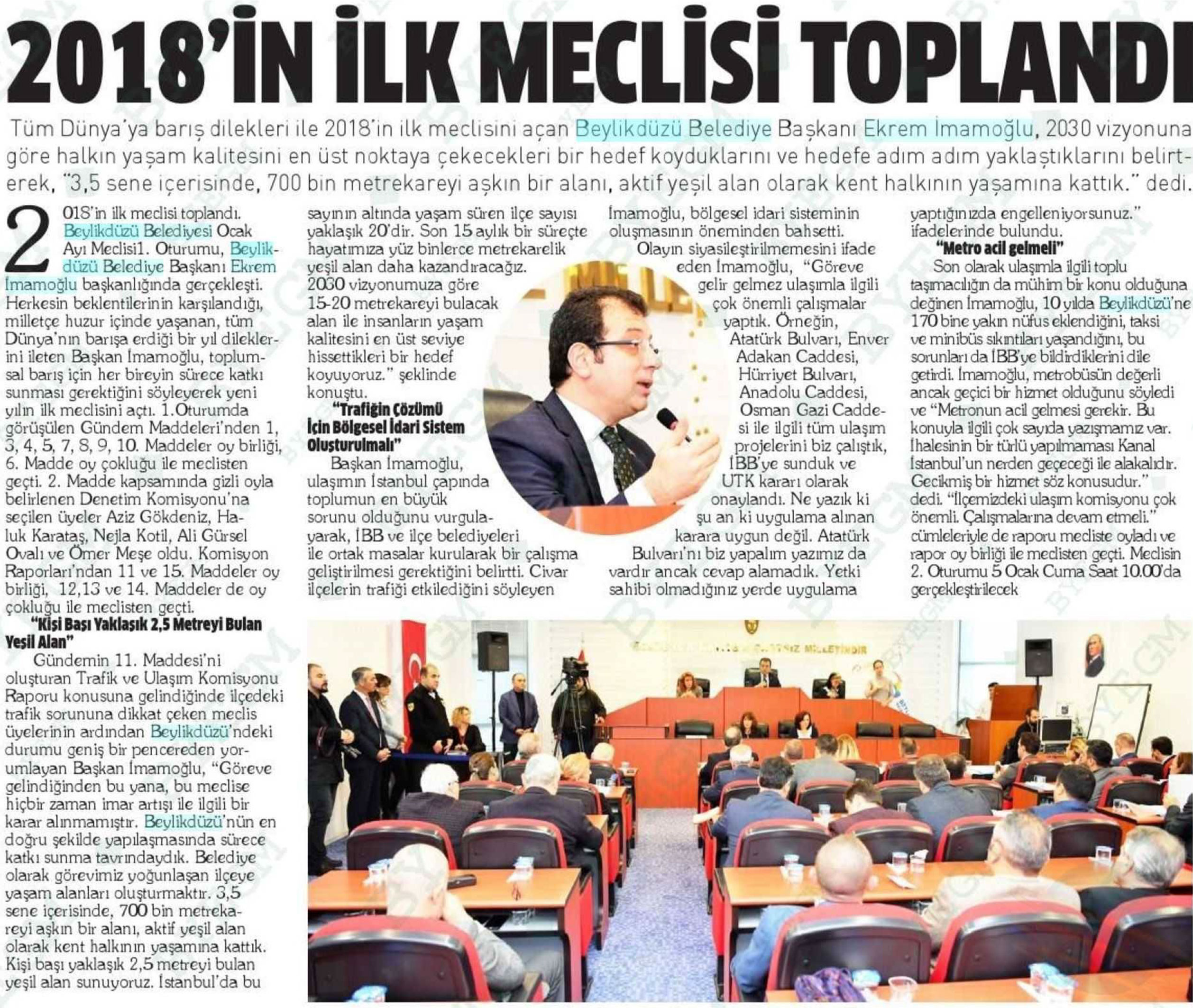 4 Ocak 2018 tarihli "HABER EKSPRESS" gazetesi. Tüm Dünya'ya barış dilekleri ile 2018'in ilk meclisini açan Beylikdüzü Belediye Başkanı Ekrem İmamoğlu, 2030 vizyonuna göre halkın yaşam kalitesini en üst noktaya çekecekleri bir hedef koyduklarını ve hedefe adım adım yaklaştıklarını belirterek, "3.5 sene içerisinde, 700 bin metrekareyi aşkın bir alanı, aktif yeşil alan olarak kent halkının yaşamına kattık." dedi.