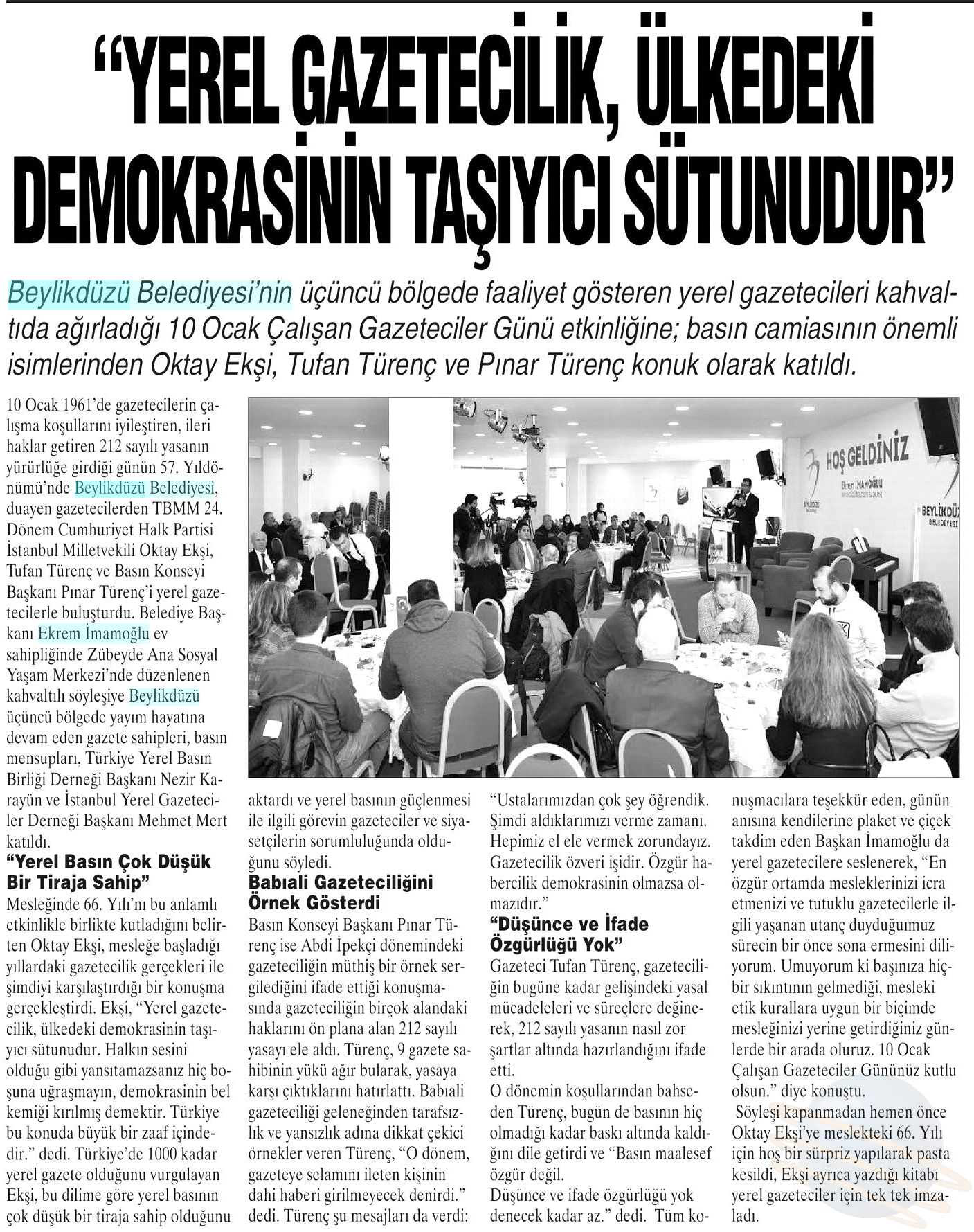 9 Ocak 2018 tarihli "BÜYÜKÇEKMECE" gazetesi. Beylikdüzü Belediyesi'nin üçüncü bölgede faaliyet gösteren yerel gazetecileri kahvaltıda ağırladığı 10 Ocak Çalışan Gazeteciler Günü etkinliğine; basın camiasının önemli isimlerinden Oktay Ekşi, Tufan Türenç ve Pınar Türenç konuk olarak katıldı.