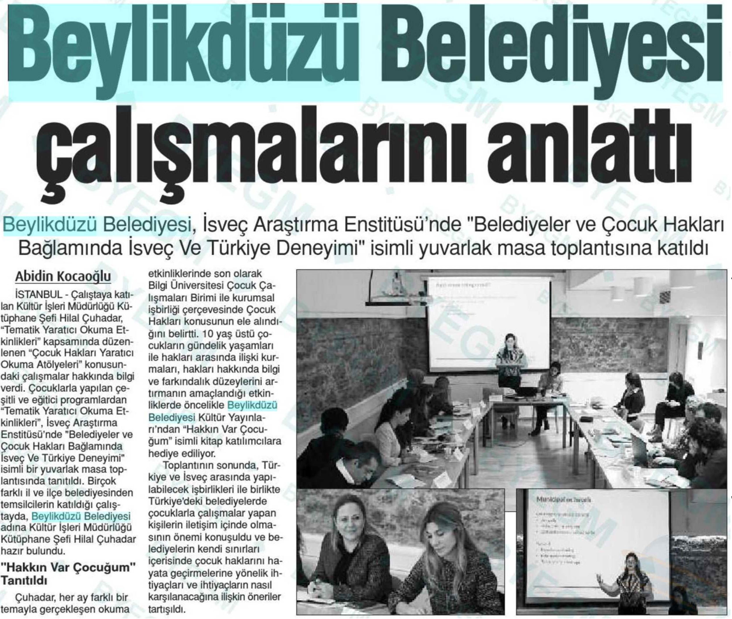 7 Ocak 2018 tarihli " YENİ ÇAĞRI" gazetesi. Beylikdüzü Belediyesi, İsveç Araştırma Enstitüsü'nde "Belediyeler ve Çocuk Hakları Bağlamında İsveç ve Türkiye Deneyimi" isimli yuvarlak masa toplantısına katıldı.