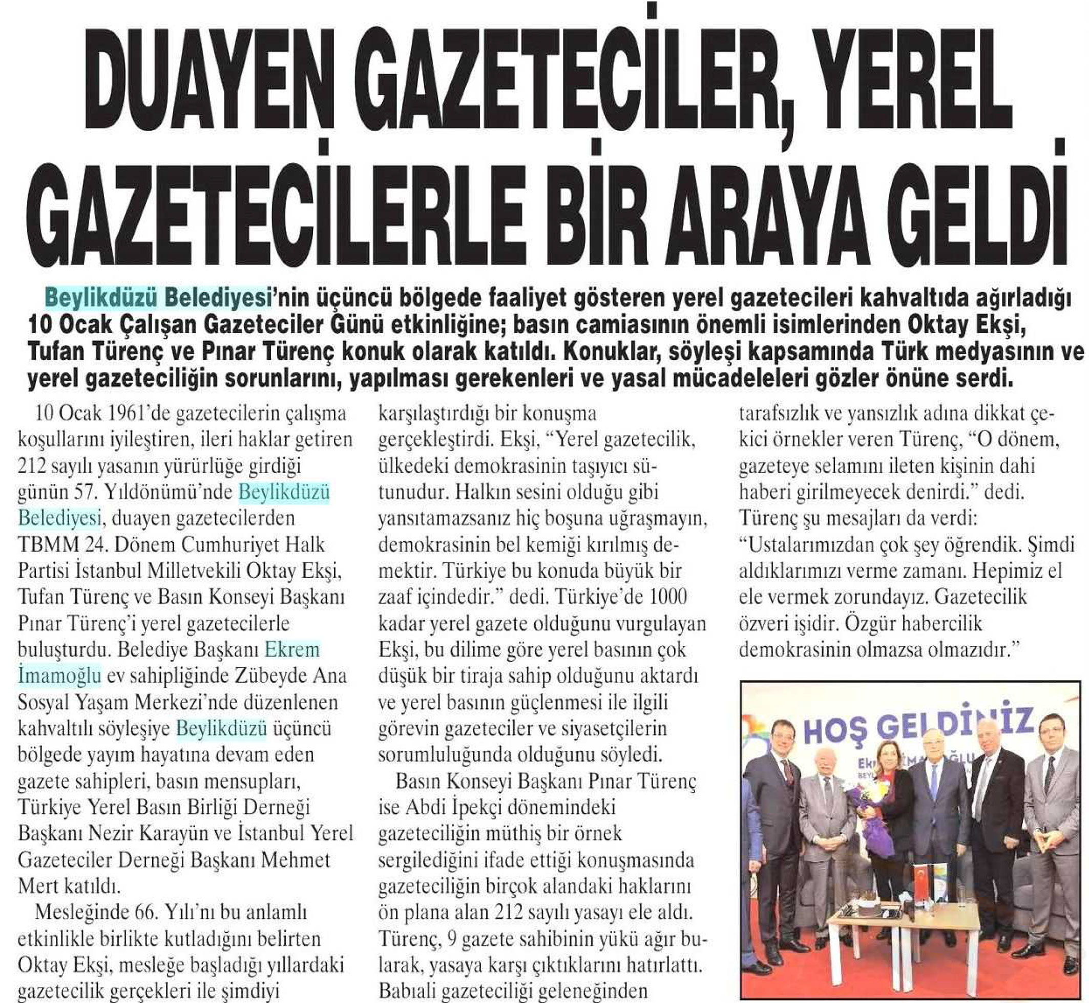 15 Ocak 2018 tarihli "YURT HABER" gazetesi. Beylikdüzü Belediyesi'nin üçüncü bölgede faaliyet gösteren yerel gazetecileri kahvaltıda ağırladığı 10 Ocak Çalışan Gazeteciler Günü Etkinliğine; basın camiasının önemli isimlerinden Oktay Ekşi, Tufan Türenç ve Pınar Türenç konuk olarak katıldı.Konuklar söyleşi kapsamında Türk medyasının ve yerel gazeteciliğin sorunlarını, yapılması gerekenleri ve yasal mücadeleleri gözler önüne serdi.