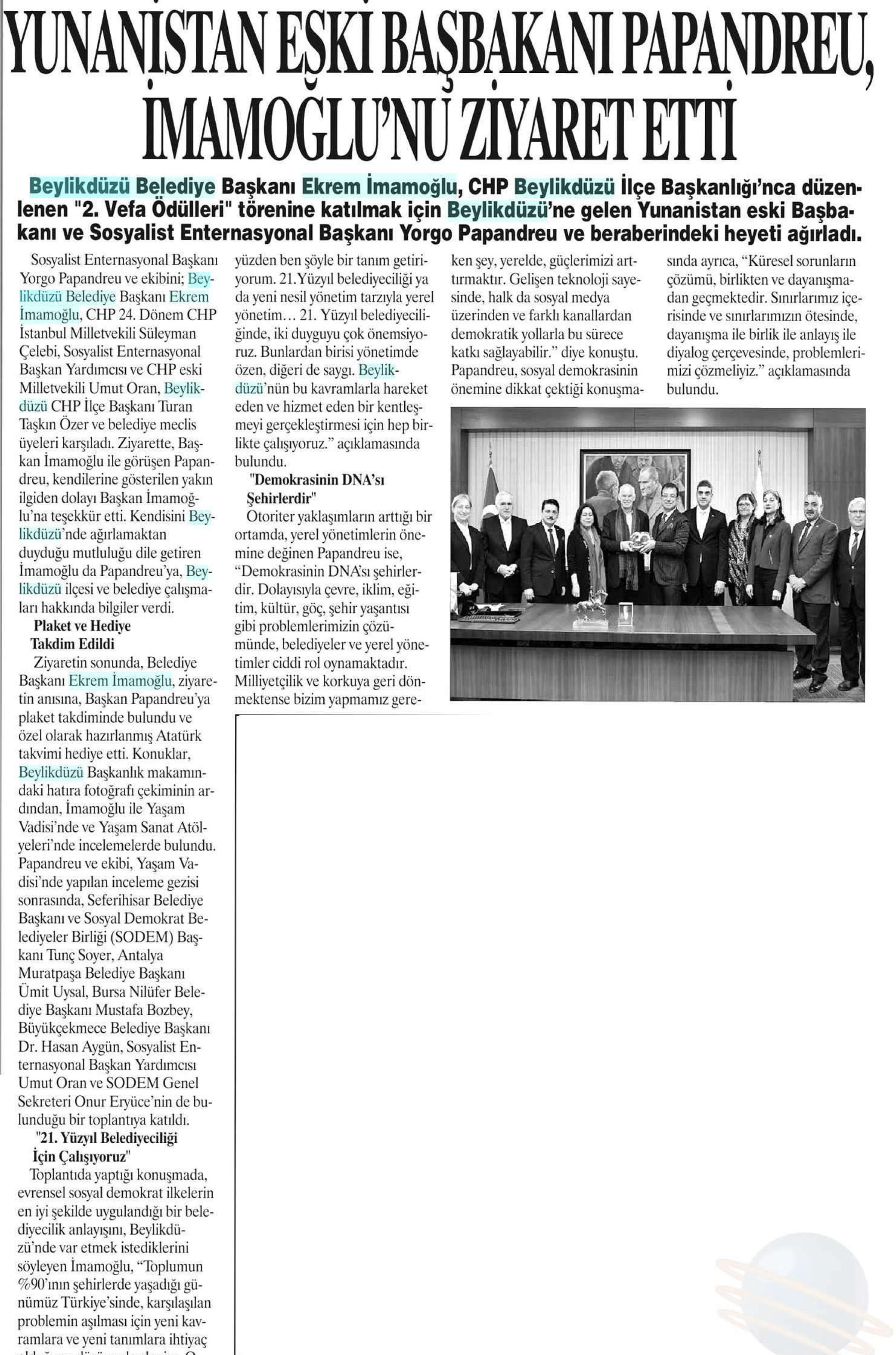 15 Ocak 2018 tarihli "YURT HABER" gazetesi. Beylikdüzü Belediye Başkanı Ekrem İmamoğlu, CHP Beylikdüzü İlçe Başkanlığı'nca düzenlenen " 2. Vefa Ödülleri" törenine katılmak için Beylikdüzü'ne gelen Yunanistan eski Başbakanı ve Sosyalist Enternasyonal Başkanı Yorgo Papandreu ve beraberindeki heyeti ağırladı.