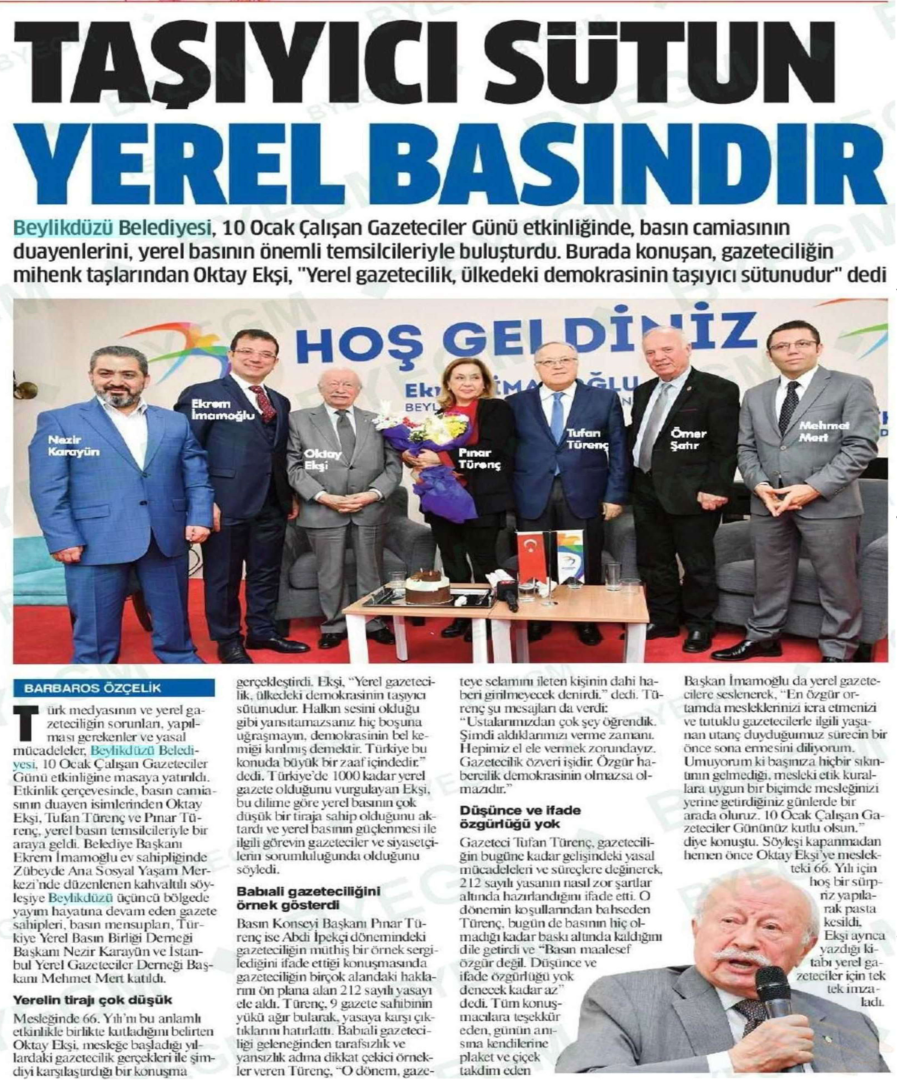 10 Ocak 2018 tarihli " BÜYÜKÇEKMECE" gazetesi. Beylikdüzü Belediyesi 10 Ocak Çalışan Gazeteciler Günü etkinliğinde, basın camiasının duayenlerini, yerel basının önemli temsilcileriyle buluşturdu. Burada konuşan, gazeteciliğin mihenk taşlarından Oktay Ekşi, "Yerel gazetecilik, ülkedeki demokrasinin taşıyıcı sütunudur" dedi.