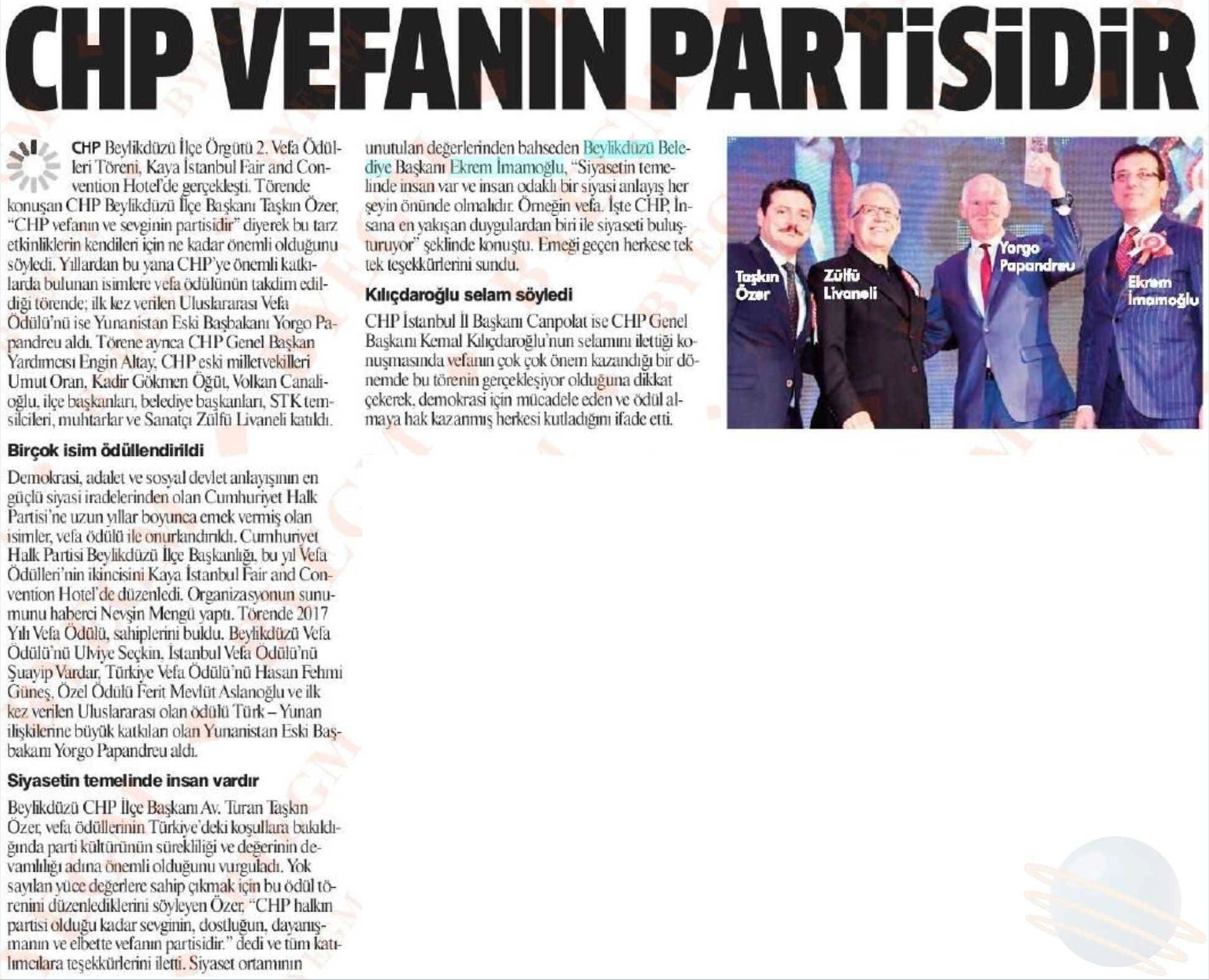 13 Ocak 2018 tarihli "DAMGA" gazetesi. CHP Beylikdüzü İlçe Örgütü 2. Vefa Ödülleri Töreni, Kaya İstanbul Fair and Convention Hotel'de gerçekleşti.