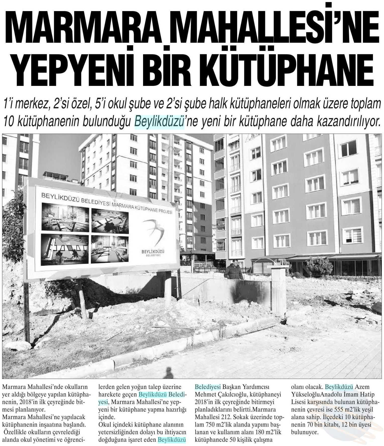 14 Ocak 2018 tarihli "BÜYÜKÇEKMECE" gazetesi. 1'i merkez, 2'si özel, 5'i okul şube ve 2'si şube halk kütüphaneleri olmak üzere toplam 10 kütüphanenin bulunduğu Beylikdüzü'ne yeni bir kütüphane daha kazandırılıyor.