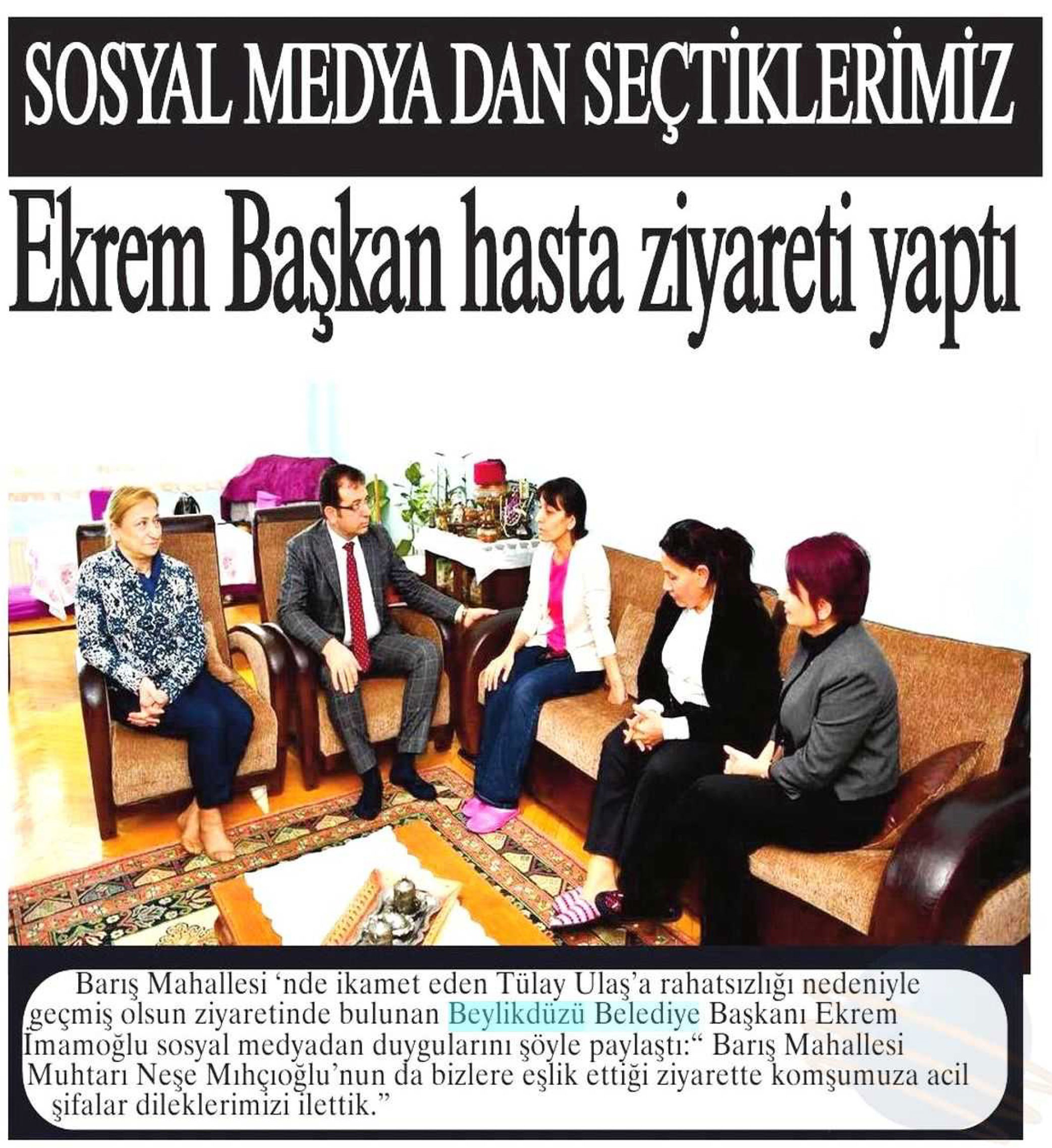 18 Ocak 2018 tarihli ''NABIZ'' gazetesi. Barış Mahallesi'nde ikamet eden Tülay Ulaş'a rahatsızlığı nedeniyle geçmiş olsun ziyaretinde bulunan Beylikdüzü Belediye Başkanı Ekrem İmamoğlu sosyal medyadan duygularını şöyle paylaştı:''Barış Mahallesi Muhtarı Neşe Mıhçıoğlu'nun da bizlere eşlik ettiği ziyarette komşumuza acil şifalar dileklerimizi ilettik.''