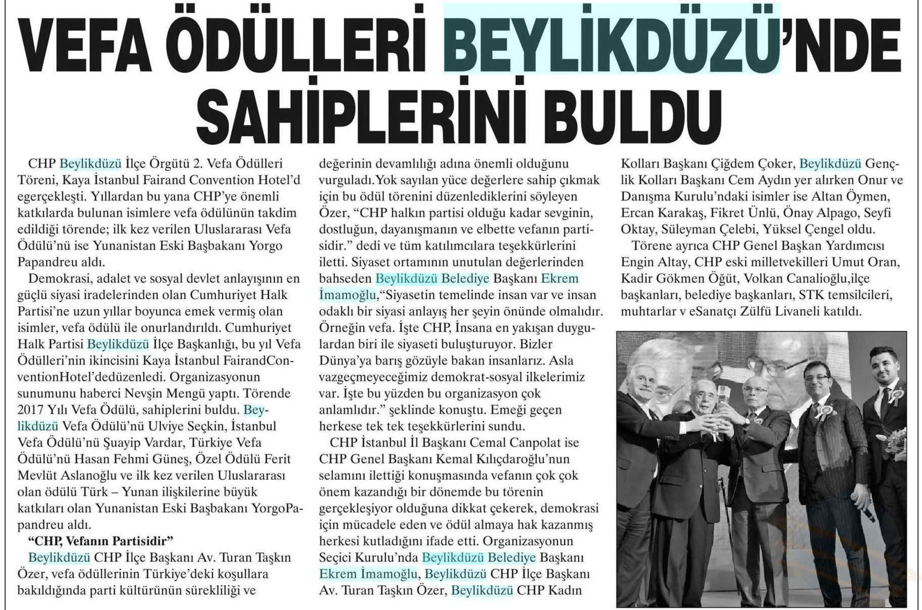 18 Ocak 2018 tarihli ''YURT'' gazetesi. CHP Beylikdüzü İlçe Örgütü 2. Vefa Ödülleri Töreni, Kaya İstanbul Fairand Convention Hotel'de Nevşin Mengü'nün sunumuyla gerçekleşti. Yıllardan bu yana CHP'ye önemli katkılarda bulunan isimlere vefa ödülünün takdim edildiği törende; ilk kez verilen Uluslararası Vefa Ödülü'nü ise Yunanistan Eski Başbakanı Yorgo Papandreu aldı.