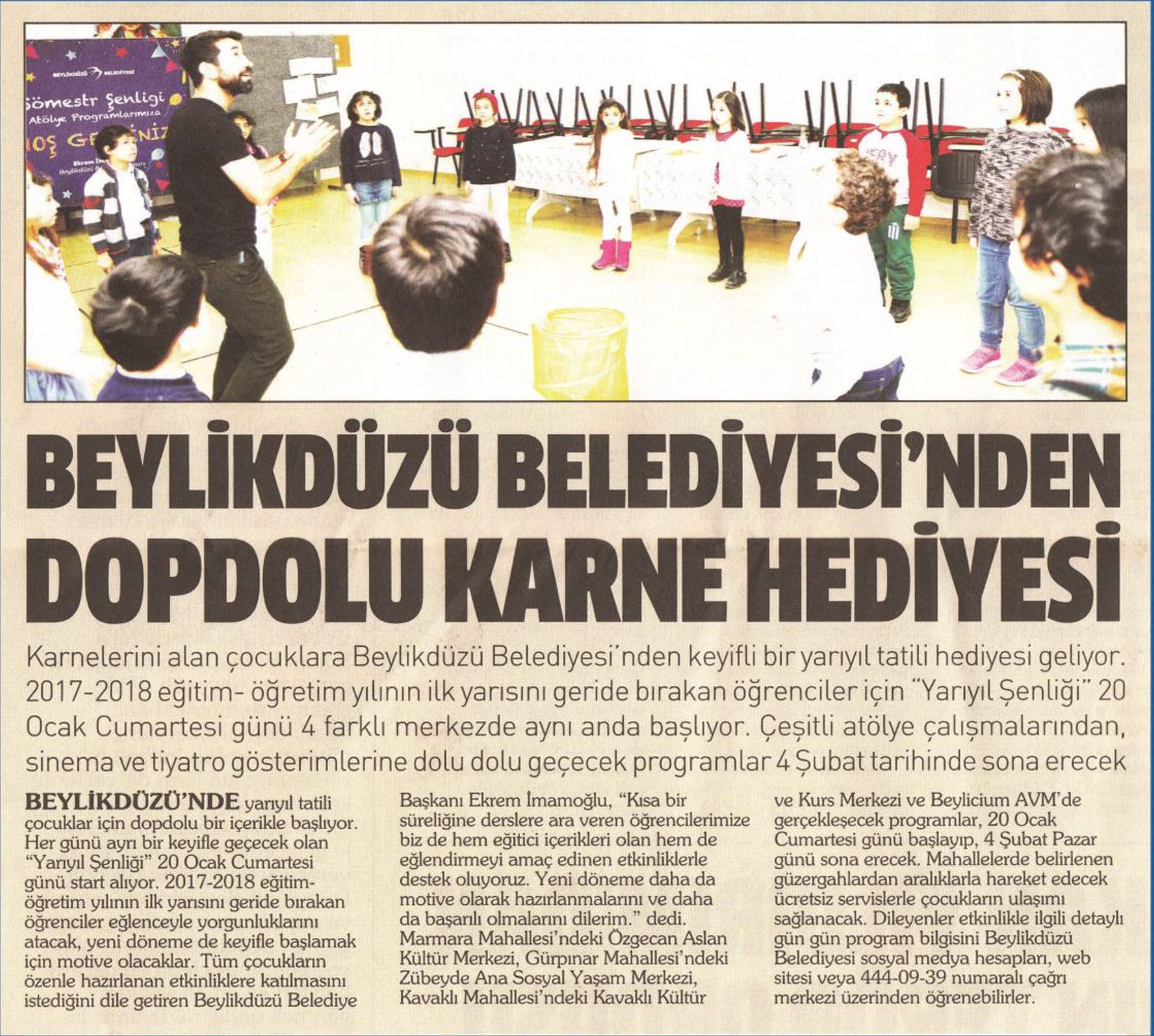 22 Ocak 2018 tarihli "TEKİN HABER" gazetesi. Karnelerini alan çocuklara Beylikdüzü Belediyesi'nden keyifli bir yarıyıl tatili hediyesi geliyor. 2017-2018 eğitim- öğretim yılının ilk yarısını geride bırakan öğrenciler için "Yarıyıl Şenliği" 20 Ocak Cumartesi günü dört farklı merkezde aynı anda başlıyor. Çeşitli atölye çalışmalarından, sinema ve tiyatro gösterimlerine dolu dolu geçecek programlar 4 Şubat tarihinde sona erecek.