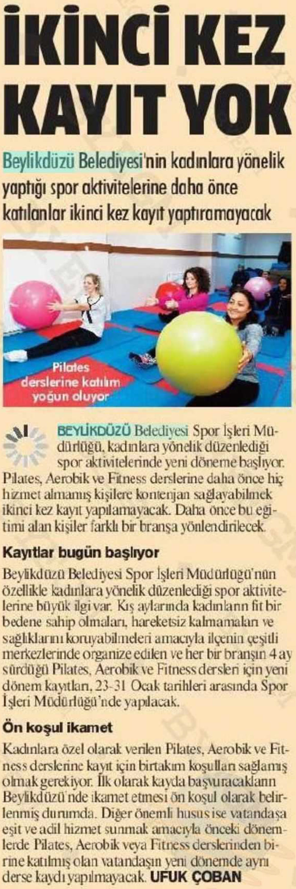 24 Ocak 2018 tarihli "Gazete Damga" gazetesi. Beylikdüzü Belediyesi Spor İşleri Müdürlüğü, kadınlara yönelik düzenlediği spor aktivitelerinde yeni döneme başlıyor. Beylikdüzü Belediyesi'nin kadınlara yönelik yaptığı spor aktivitelerine daha önce katılanlar ikinci kez kayıt yaptırmayacak.