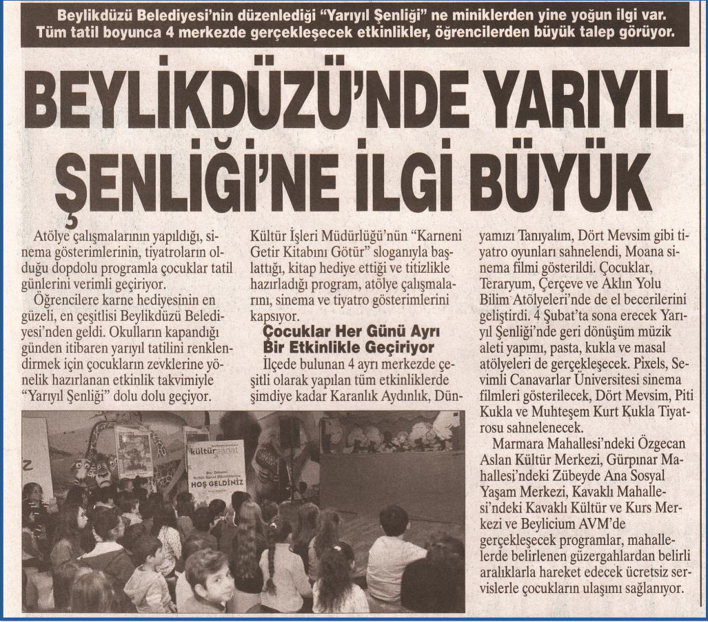 26 Ocak 2018 tarihli "BÜYÜKÇEKMECE" gazetesi. Beylikdüzü Belediyesi'nin "Yarıyıl Şenliği" ne miniklerden yine yoğun ilgi var. Tüm tatil boyunca 4 merkezde gerçekleşecek etkinlikler, öğrencilerden büyük talep görüyor.