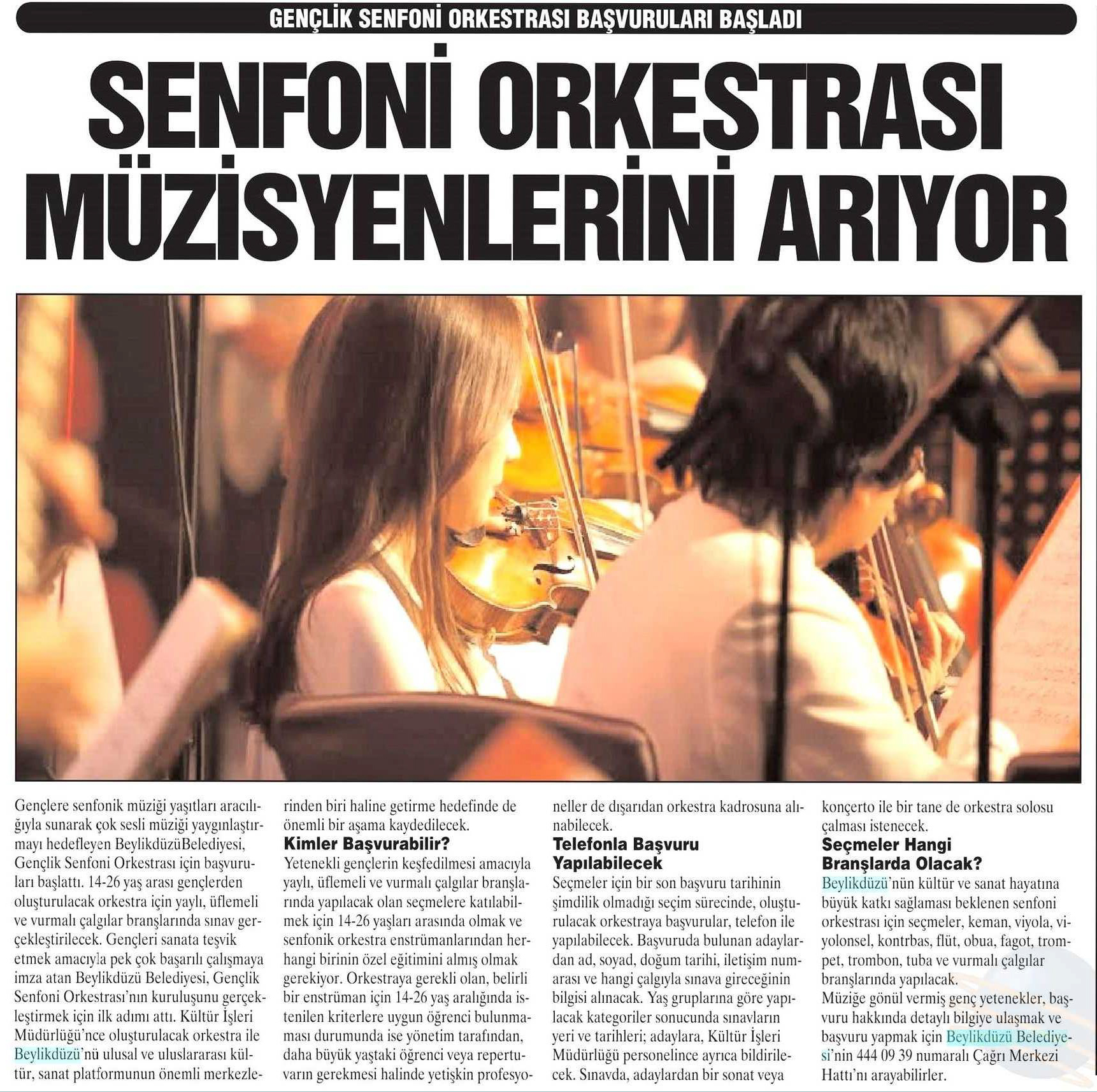 29 Ocak 2018 tarihli "BÜYÜKÇEKMECE" gazetesi. Gençlere senfonik müziği yaşıtları aracılığıyla sunarak çok sesli müziği yaygınlaştırmayı hedefleyen Beylikdüzü Belediyesi, Gençlik Senfoni Orkestrası için başvururları başlattı. 14-26 yaş arası gençlerden oluşturulacak orkestra için yaylı , üflemeli ve vurmalı çalgılar branşlar arasında sınav gerçekleştirilecek.