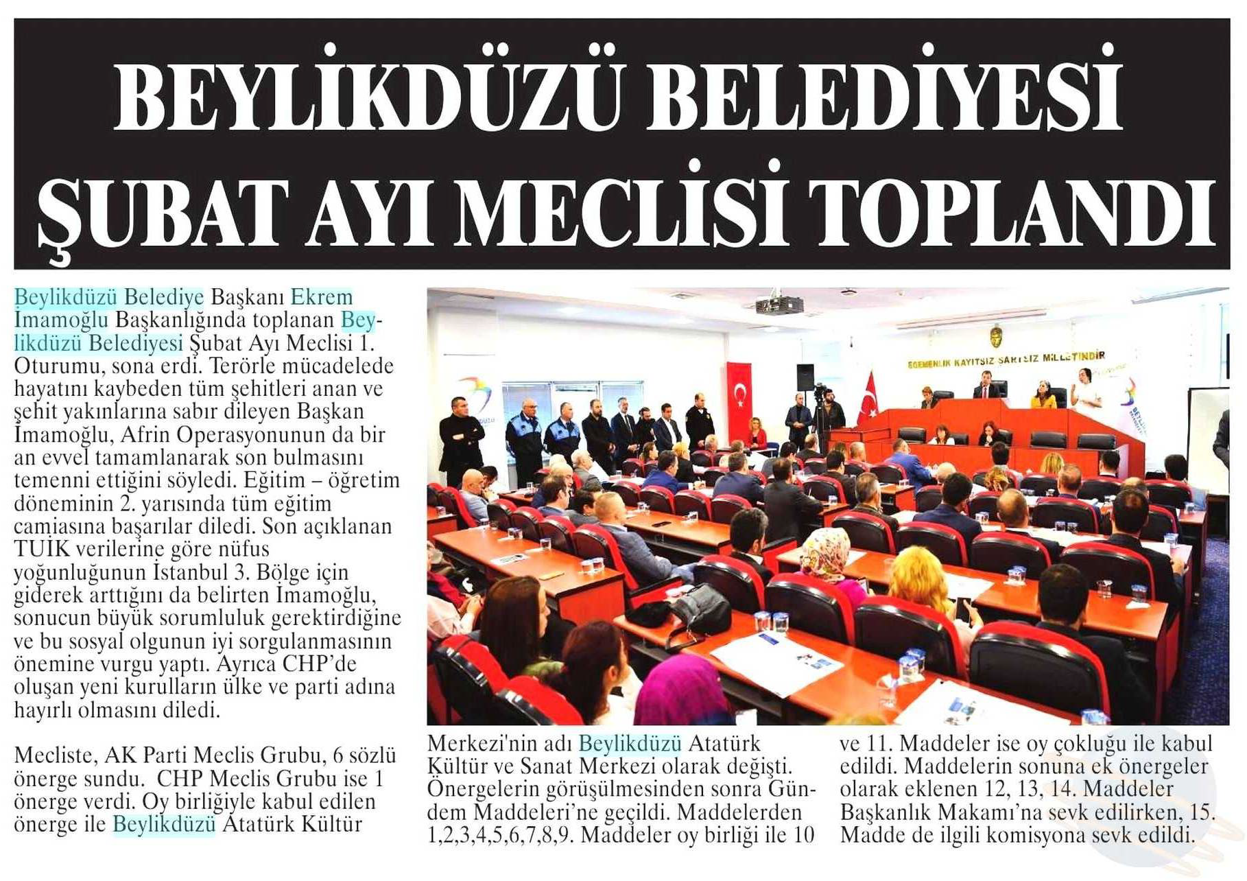 6 Şubat 2018 tarihli "NABIZ" gazetesi. Beylikdüzü Belediye Başkan Ekrem İmamoğlu Başkanlığında toplanan Beylikdüzü Belediyesi Şubat Ayı Meclisi 1. Oturumu, sona erdi