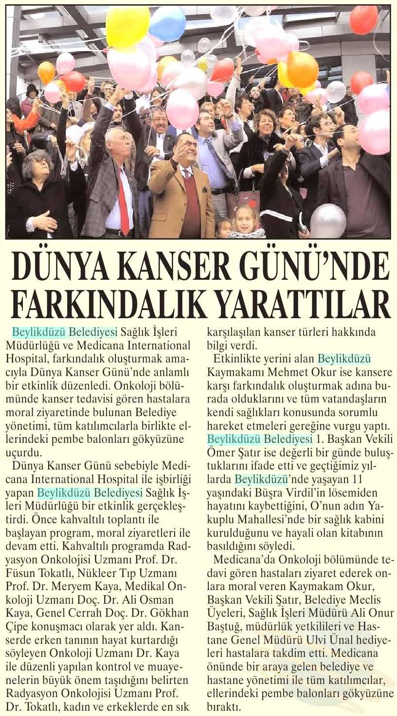 6 Şubat 2018 tarihli "YURT HABER" gazetesi. Beylikdüzü Belediyesi Sağlık İşleri Müdürlüğü ve Medicana International Hospital, farkındalık oluşturmak amacıyla Dünya Kanser Günü'nde anlamlı bir etkinlik düzenledi.