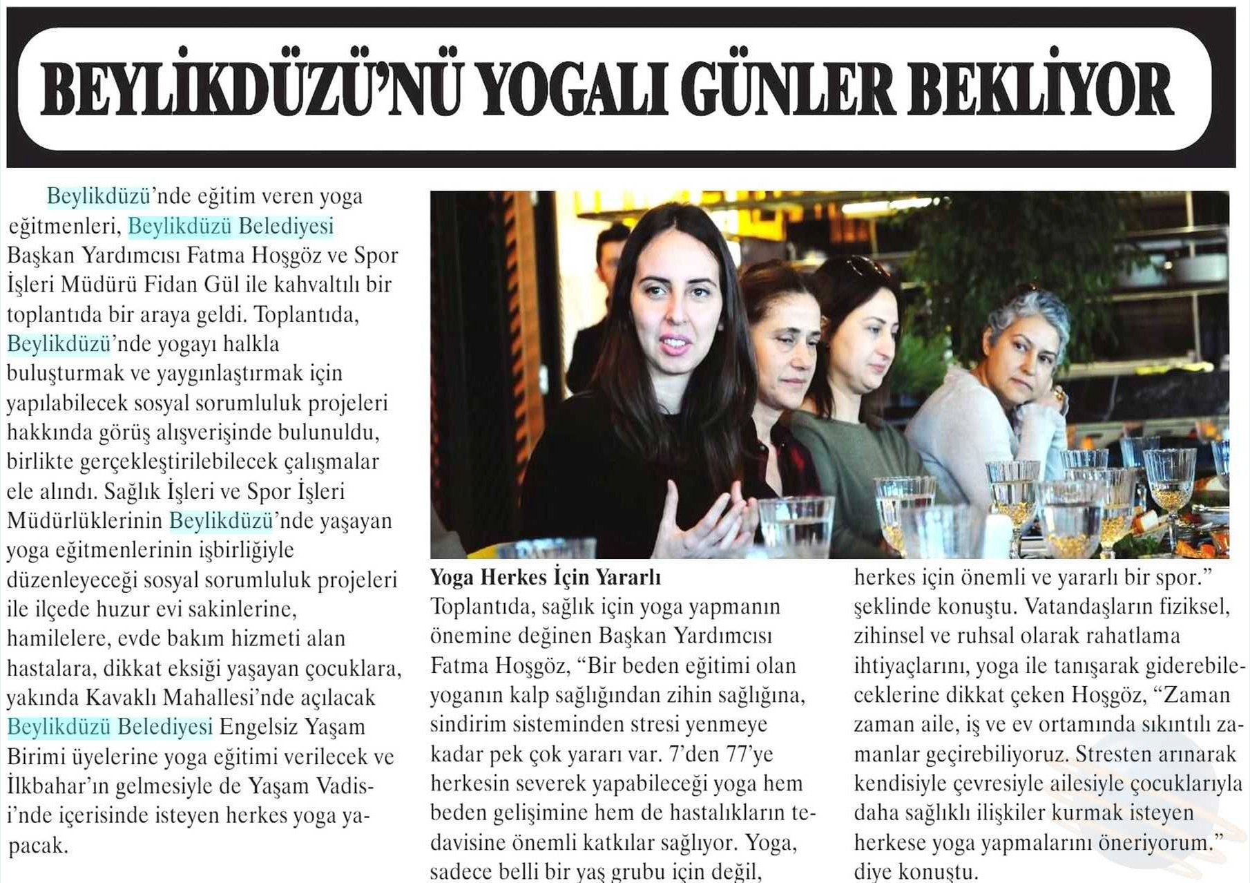 7 Şubat 2018 tarihli "NABIZ" gazetesi. Beylikdüzü'nde eğitim veren yoga eğitmenleri, Beylikdüzü Belediyesi Başkan Yardımcısı Fatma Hoşgöz ve Spor İşleri Müdürü Fidan Gül ile kahvaltılı bir toplantıda bir araya geldi.