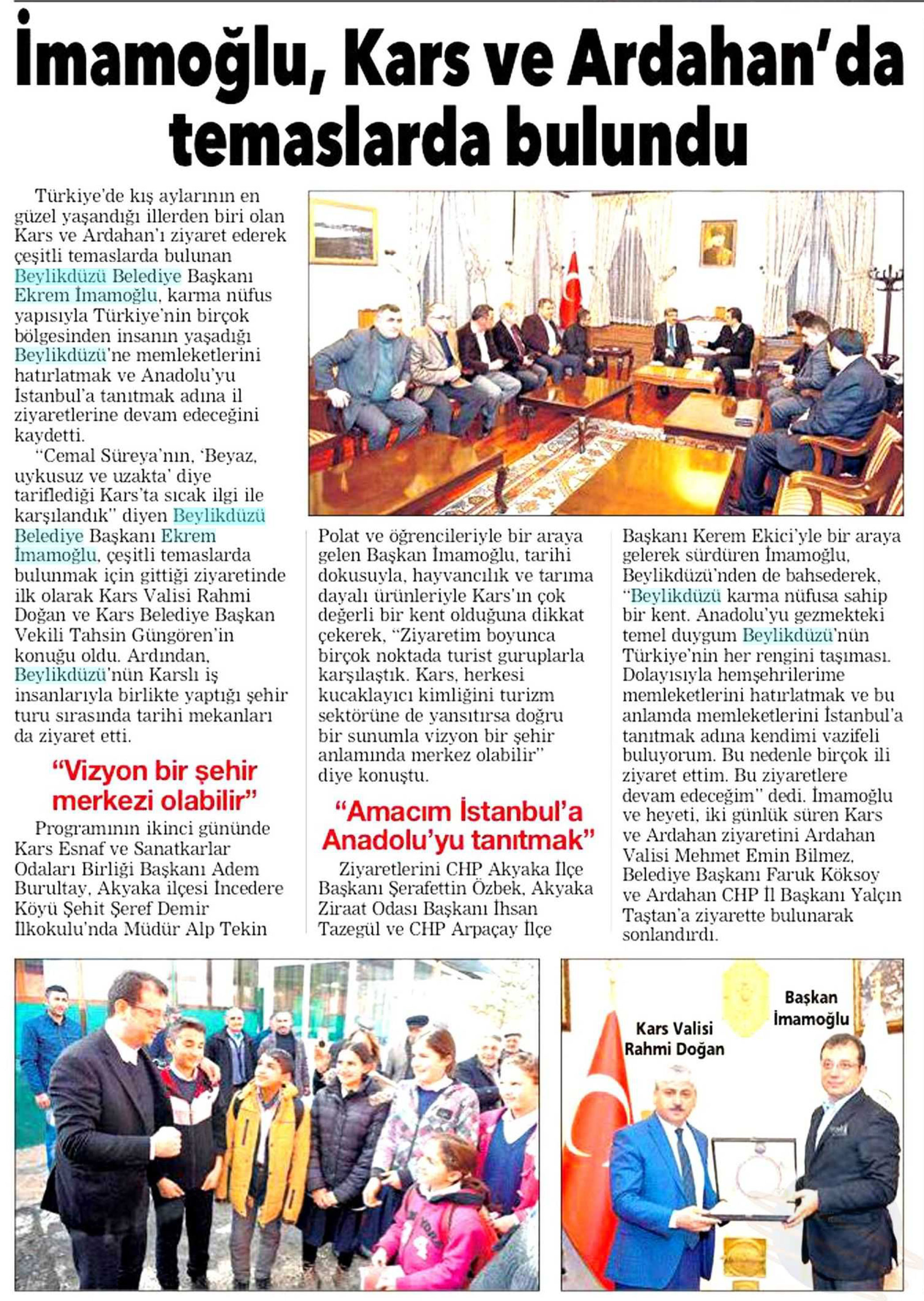 11 Şubat 2018 tarihli "POSTA TRAKYA" gazetesi. Türkiye'de kış aylarının en güzel yaşandığı illerden biri olan Kars ve Ardahan'ı ziyaret ederek çeşitli temaslarda bulunan Beylikdüzü Belediye Başkanı Emrem İmamoğlu, karma nüfus yapısıyla Türkiye'nin birçok bölgesinden insanın yaşadığı Beylikdüzü'ne ve memleketlerini hatırlatmak ve Anadolu'yu İstanbul'a tanıtmak adına il ziyeretlerine devam edeceğini kaydetti.