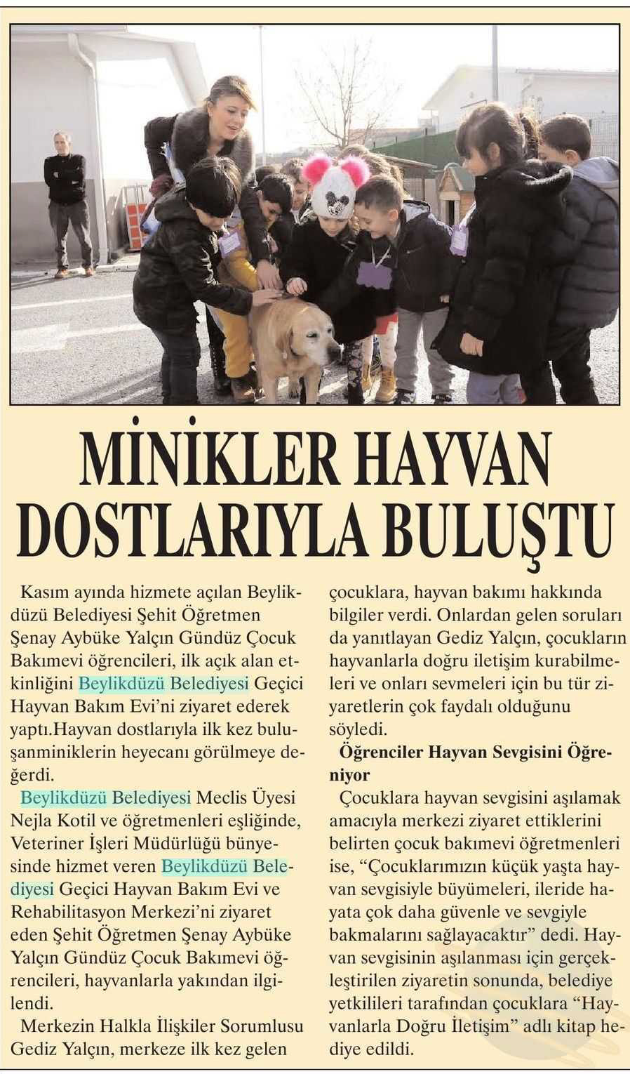 13 Şubat 2018 tarihli " YURT HABER " gazetesi. Kasım ayında hizmete açılan Beylikdüzü Belediyesi Şehit Öğretmen Şenay Aybüke Yalçın Gündüz Çocuk Bakımevi öğrencileri, ilk açık alan etkinliğini Beylikdüzü Belediyesi Geçici Hayvan Bakım Evi'ni ziyaret ederek yaptı.