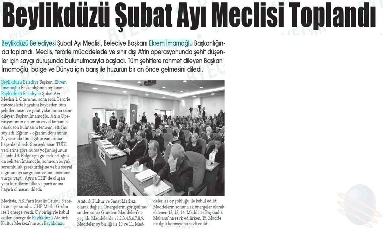 14 Şubat 2018 tarihli "İKTİDAR" gazetesi. Beylikdüzü Belediyesi Şubat Ayı Meclisi, Belediye Başkanı Ekrem İmamoğlu Başkanlığında toplandı. Meclis, terörle mücadelede ve sınır dışı Afrin operasyonunda şehit düşenler için saygı duruşunda bulunulmasıyla başladı. Tüm şehitlere rahmet dileyen Başkan İmamoğlu, bölge ve Dünya için barış ve huzurun bir an önce gelmesini diledi.