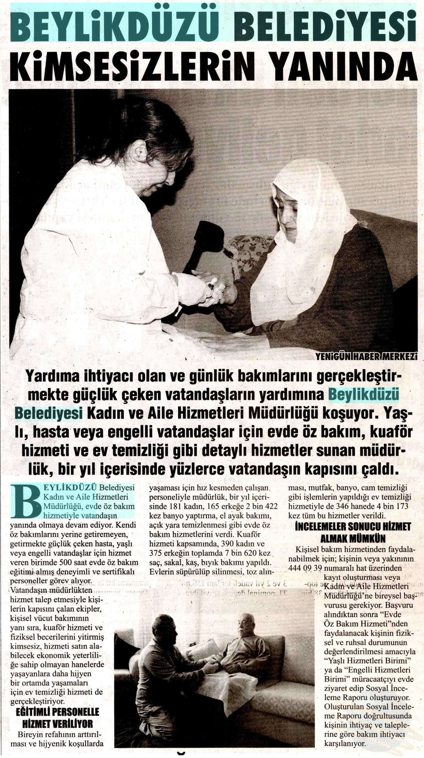 17 Şubat 2018 tarihli "YENİGÜN" gazetesi. Yardıma ihtiyacı olan ve günlük bakımlarını gerçekleştirmekte güçlük çeken vatandaşların yardımına Beylikdüzü Belediyesi Kadın ve Aile Hizmetleri Müdürlüğü koşuyor. Yaşlı, hasta veya engelli vatandaşlar için evde öz bakım, kuaför hizmeti ve ev temizliği gibi detaylı hizmetler sunan müdürlük, bir yıl içerisinde yüzlerce vatandaşın kapsını çaldı.