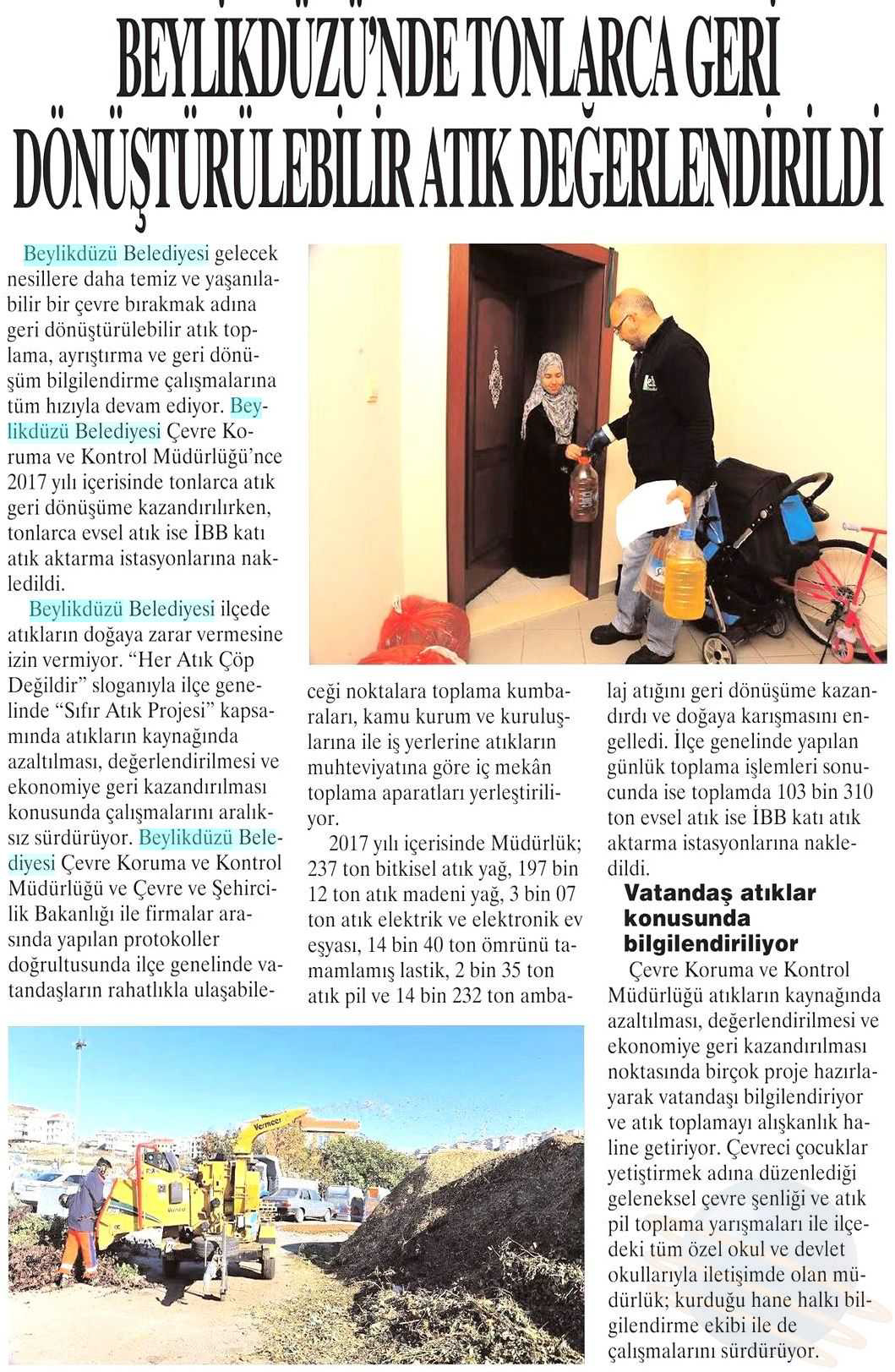 19 Şubat 2018 "BÜYÜKÇEKMECE" gazetesi. Beylikdüzü Belediyesi gelecek nesillere daha temiz ve yaşanılabilir bir çevre bırakmak adına geri dönüştürülebilir atık toplama, ayrıştırma ve geri dönüşüm bilgilendirme çalışmalarına tüm hızıyla devam ediyor.