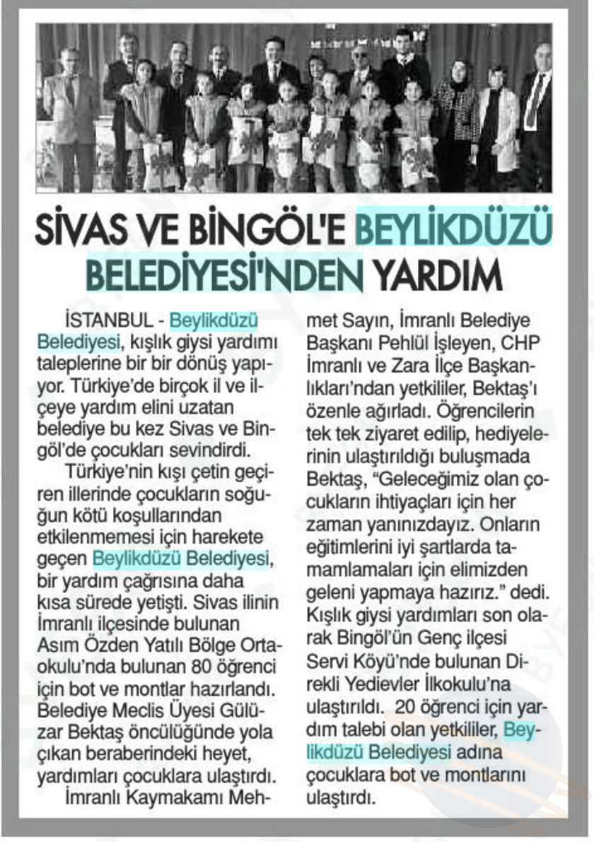 20 Şubat 2018 tarihli "ÖNCE VATAN" gazetesi. Beylikdüzü Belediyesi, kışlık giysi yardımı taleplerine bir bir dönüş yapıyor. Türkiye'de birçok il ve ilçeye yardım elini uzatan belediye bu kez Sivas ve Bingöl'de çocukları sevindirdi.