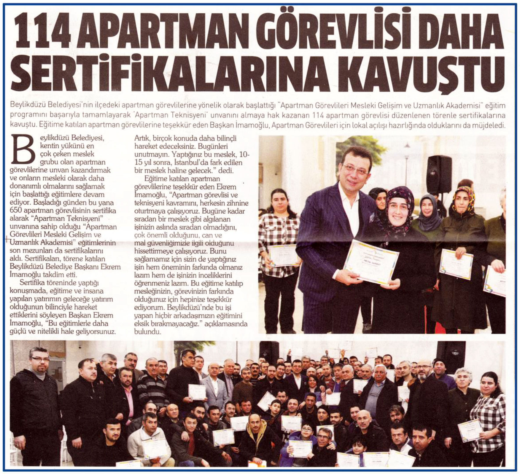 21 Şubat 2018 tarihli "HABER EKSPRESS" gazetesi. Beylikdüzü Belediyesi'nin ilçedeki apartman görevlilerine yönelik olarak başlattığı "Apartman Görevlileri Mesleki Gelişim ve Uzmanlık Akademisi" eğitim programını başarıyla tamamlayarak 'Apartman Teknisyeni' ünvanını almaya halk kazanan 114 apartman görevlisi düzenlenen törenle sertifikalarına kavuştu.