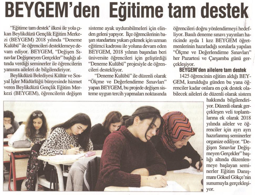 20 Şubat 2018 tarihli "BİZİM YAŞAM" gazetesi. "Eğitime tam destek" ilkesi ile yola çıkan Beylikdüzü Genç Eğitim Merkezi (BEYGEM) 2018 yılında "Deneme Kulübü" ile öğrencileri desteklemeye devam ediyor. BEYGEM, "Değişen Sınavlar Değişmeyen Gerçekler" başlığı altında verdiği seminerler ile öğrencilerin yanı sıra aileleri de bilgilendiriyor.