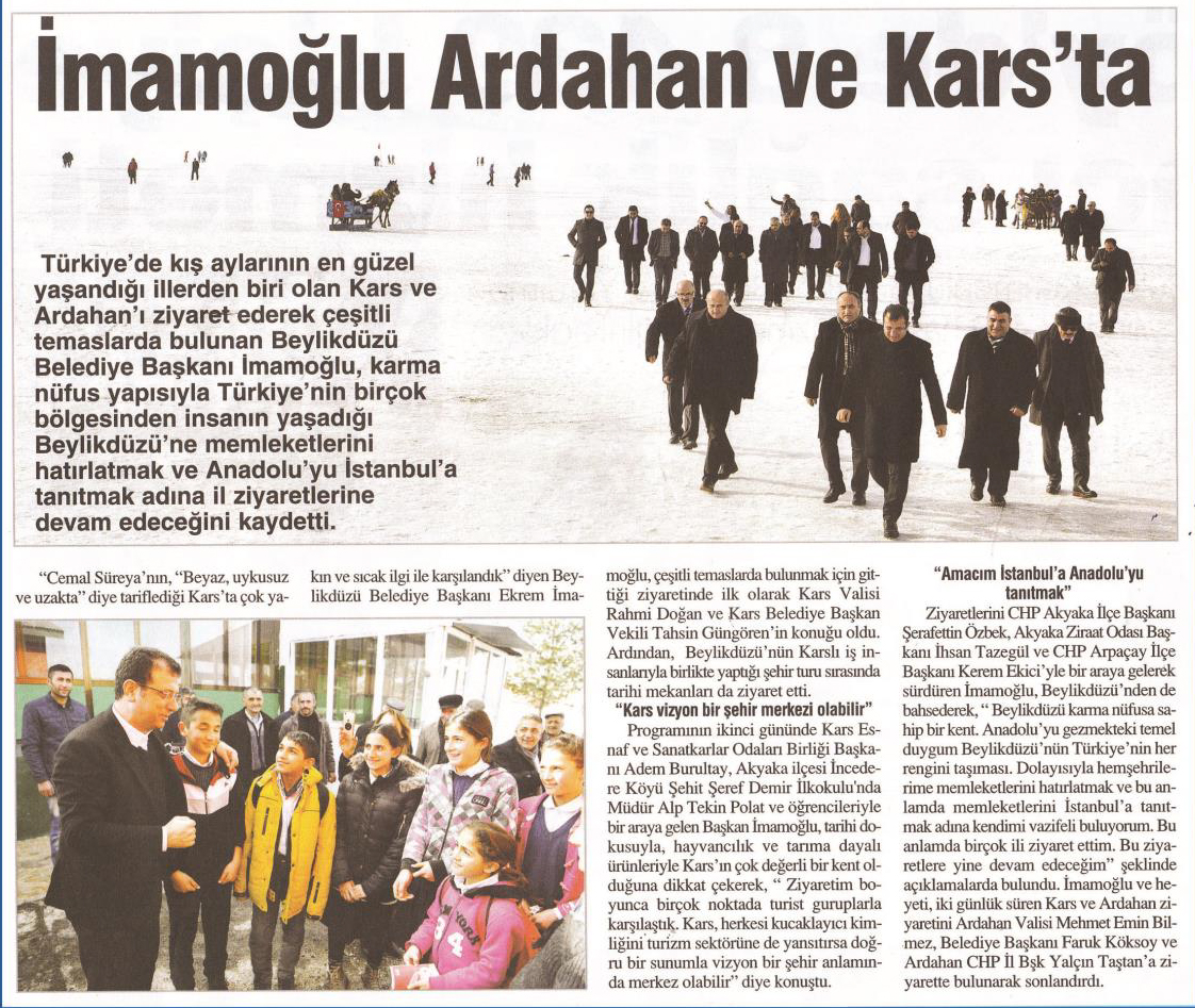 20 Şubat 2018 tarihli "BİZİM YAŞAM" gazetesi. Kars ve Ardahan'ı ziyaret ederek çeşitli temaslarda bulunan Beylikdüzü Belediye Baskanı Ekrem İmamoğlu, karma nüfus yapısıyla Türkiye'nin bir çok bölgesinden insanın yaşadığı Beylikdüzü'ne memleketlerini hatırlatmak ve Anadolu'yu İstanbul'a tanıtmak adına il ziyaretlerine devam edeceğini kaydetti.