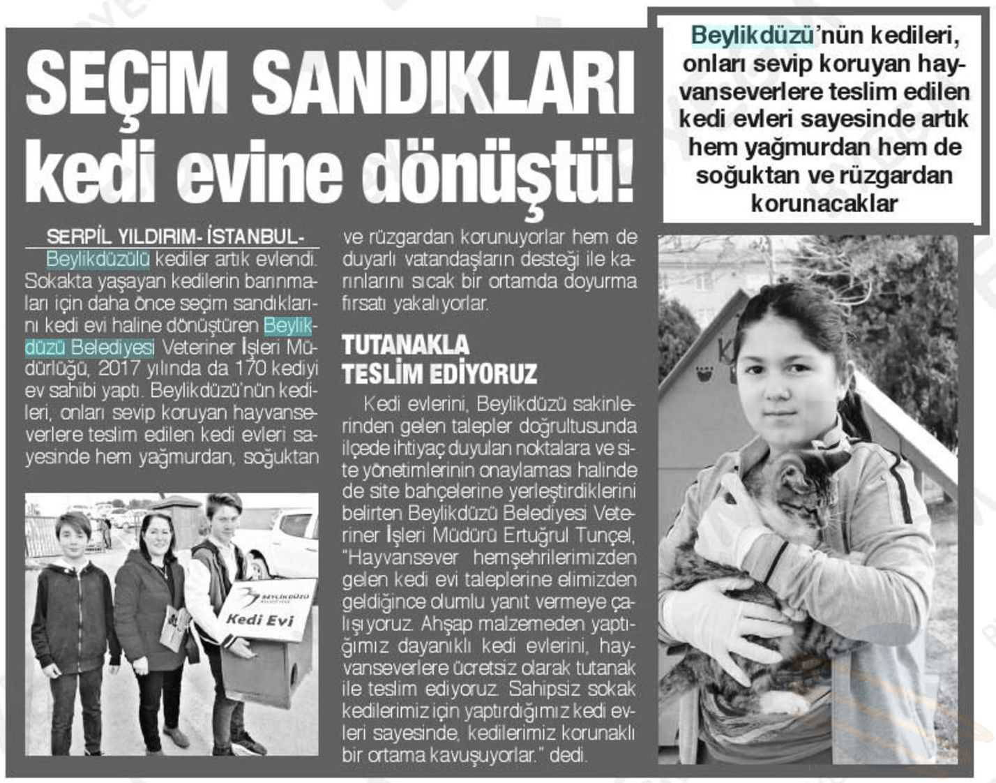 24 Şubat 2018 tarihli "BİZİM ANADOLU" gazetesi. Beylikdüzü'nün kedileri onları sevip koruyan hayvanseverlere teslim edilen kedi evleri sayesinde artık hem yağmurdan hem de soğuktan ve rüzgardan korunacak. Beylikdüzü Belediyesi Veteriner İşleri Müdürlüğü , 2017 yılında da 170 kediyi ev sahibi yaptı.