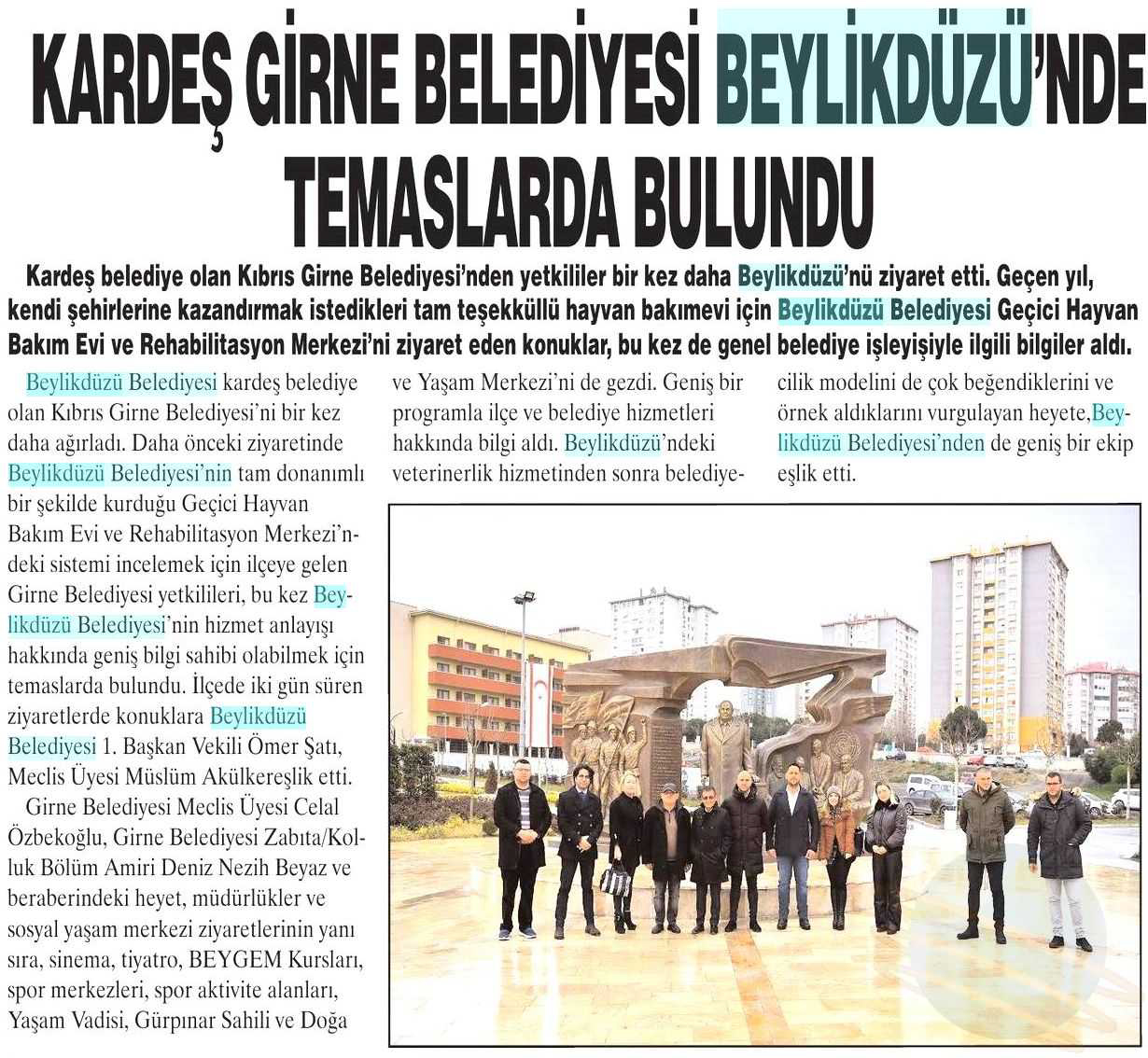 26 Şubat 2018 tarihli "YURT HABER" gazetesi. Kardeş belediye olan Kıbrıs Belediyesi'nden yetkililer bir kez daha Beylikdüzü'nü ziyaret etti. Geçen yıl, kendi şehirlerine kazandırmak istedikleri tam teşekküllü hayvan bakımevi için Beylikdüzü Belediyesi Geçici Hayvan Bakım Evi ve Rehabilitasyon Merkezi'ni ziyaret eden konuklar, bu kez de genel belediye işleyişiyle ilgili bilgiler aldı.