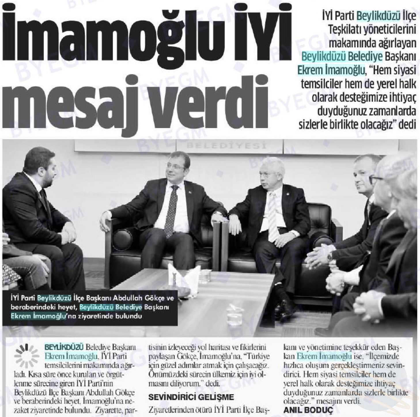 28 Şubat 2018 tarihli " DAMGA" gazetesi. İYİ PARTİ Beylikdüzü İlçe Teşkilat yöneticilerini makamında ağarlayan Beylikdüzü Belediye Başkanı Ekrem İmamoğlu, "Hem siyasi temsilciler hem de yerel halk olarak desteğimize ihtiyaç duyduğunuz zamanlarda sizlerle birlikte olacağız" dedi.