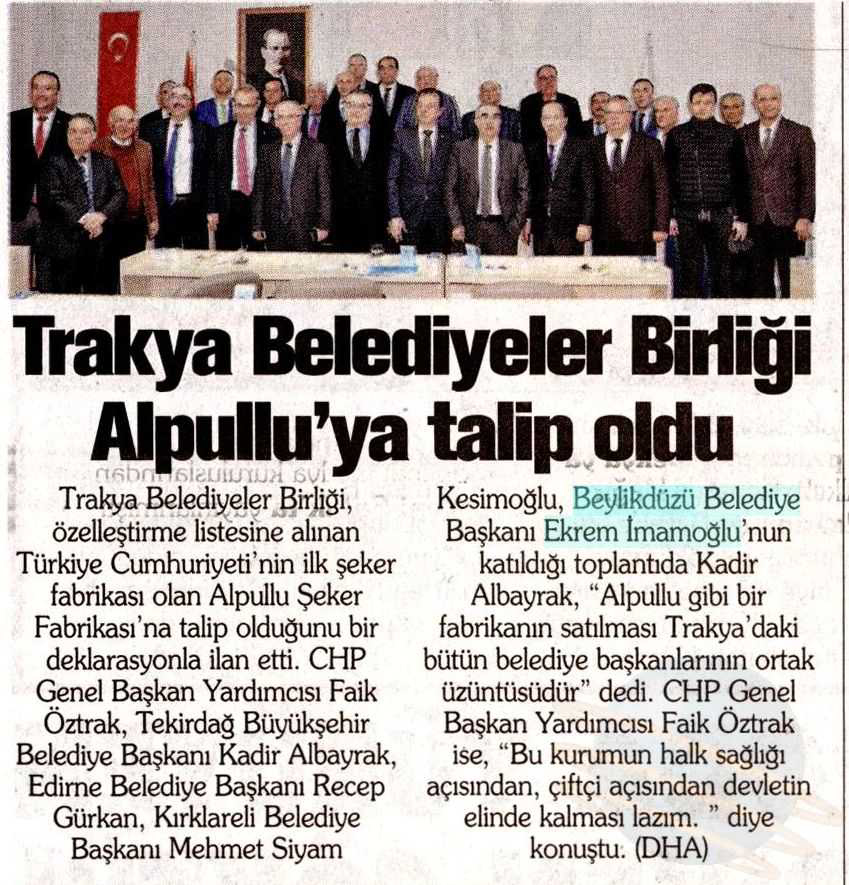 28 Şubat 2018 tarihli "KORKUSUZ" gazetesi. Trakya Belediyeler Birliği, özelleştirme listesine alınan Türkiye Cumhuriyeti'nin ilk şeker fabrikası olan Alpullu Şeker Fabrikası'na talip olduğunu bir deklarasyonla ilan etti. Beylikdüzü Belediye Başkanı Ekrem İmamoğlu'nun da katıldığı toplantıda Kadir Albayrak, "Alpullu gibi bir fabrikanın satılması Trakya'daki bütün belediye başkanlarının ortak üzüntüsüdür" dedi.