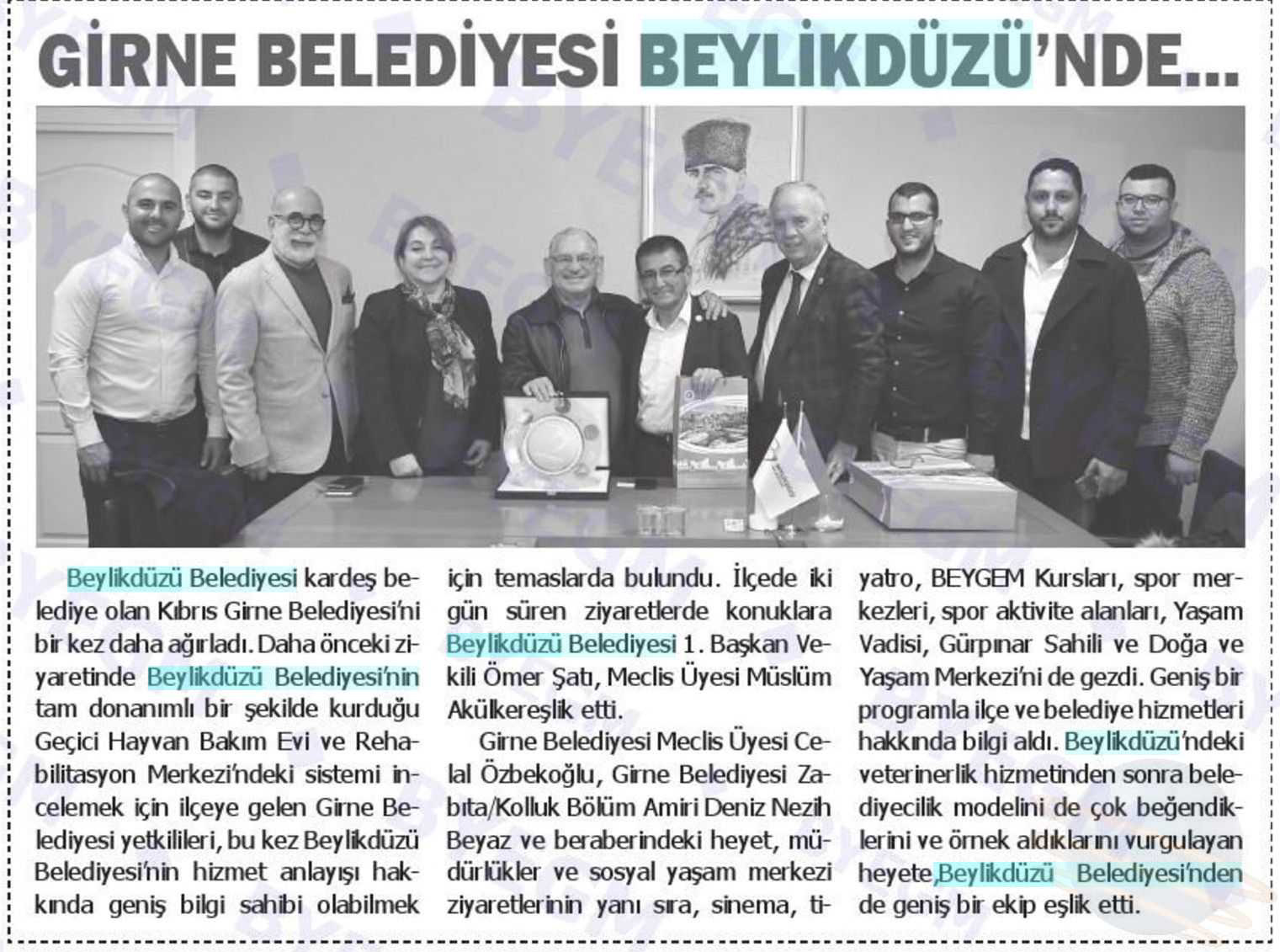 27 Şubat 2018 tarihli " İÇ SES" gazetesi. Beylikdüzü Belediyesi kardeş belediye olan Kıbrıs Girne Belediyesi'ni bir kez daha ağırladı. Beylikdüzü Belediyesi'nin hizmet anlayışı hakkında geniş bilgi sahibi olabilmek için temaslarda bulunan Girne Belediyesi yetkililerine, Beylikdüzü Belediyesi 1. Başkan Vekili Ömer Şatır ve Meclis Üyesi Müslüm Akülker eşlik etti.