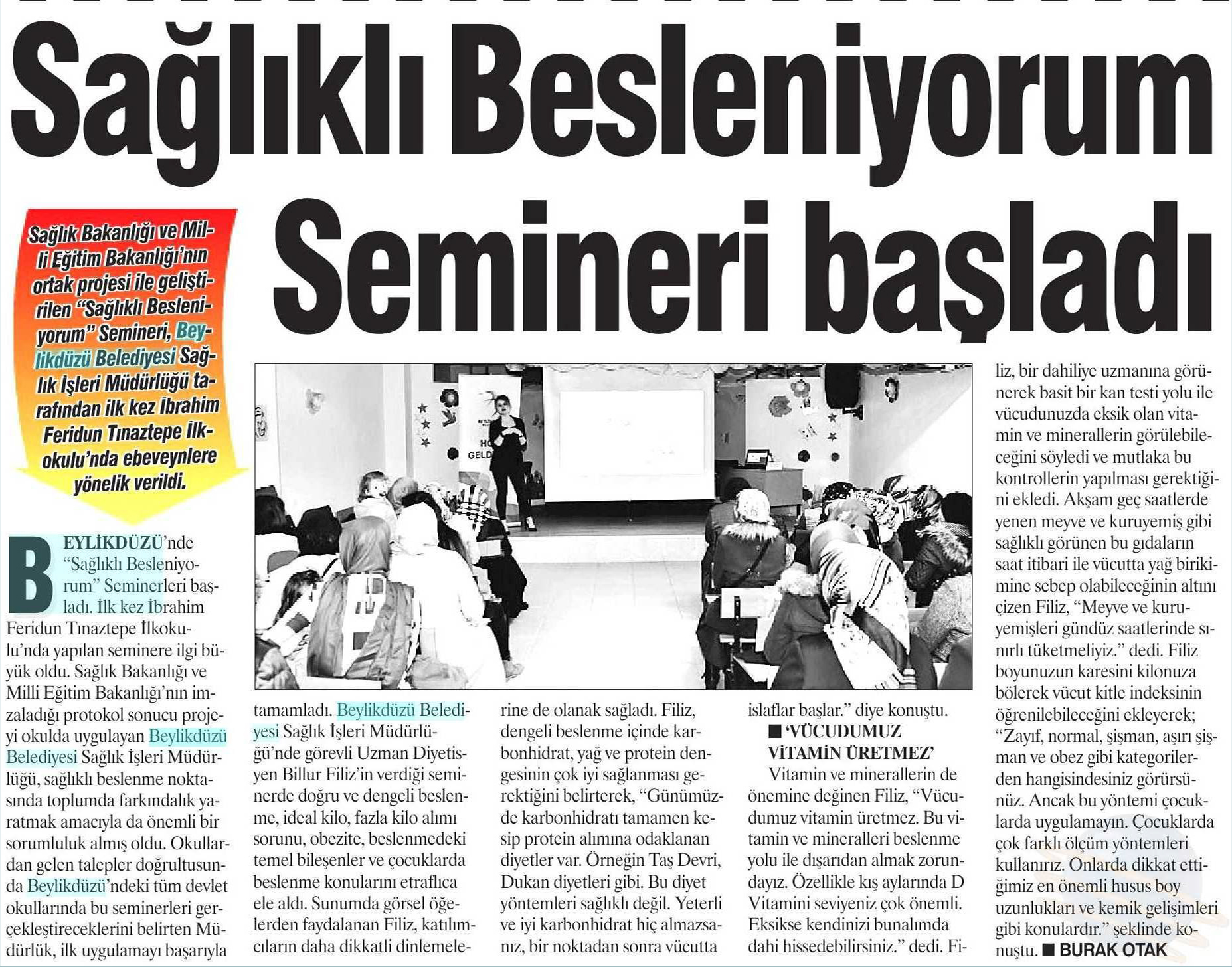 27 Şubat 2018 tarihli "DOKUZ SÜTUN" gazetesi. Sağlık Bakanlığı ve Milli eğitim Bakanlığı'nın ortak projesi ile geliştirilen "Sağlıklı Besleniyorum" Semineri, Beylikdüzü Belediyesi Sağlık İşleri Müdürlüğü tarafından ilk kez İbrahim Feridun Tınaztepe İlkokulu'nda ebeveynlere yönelik verildi.