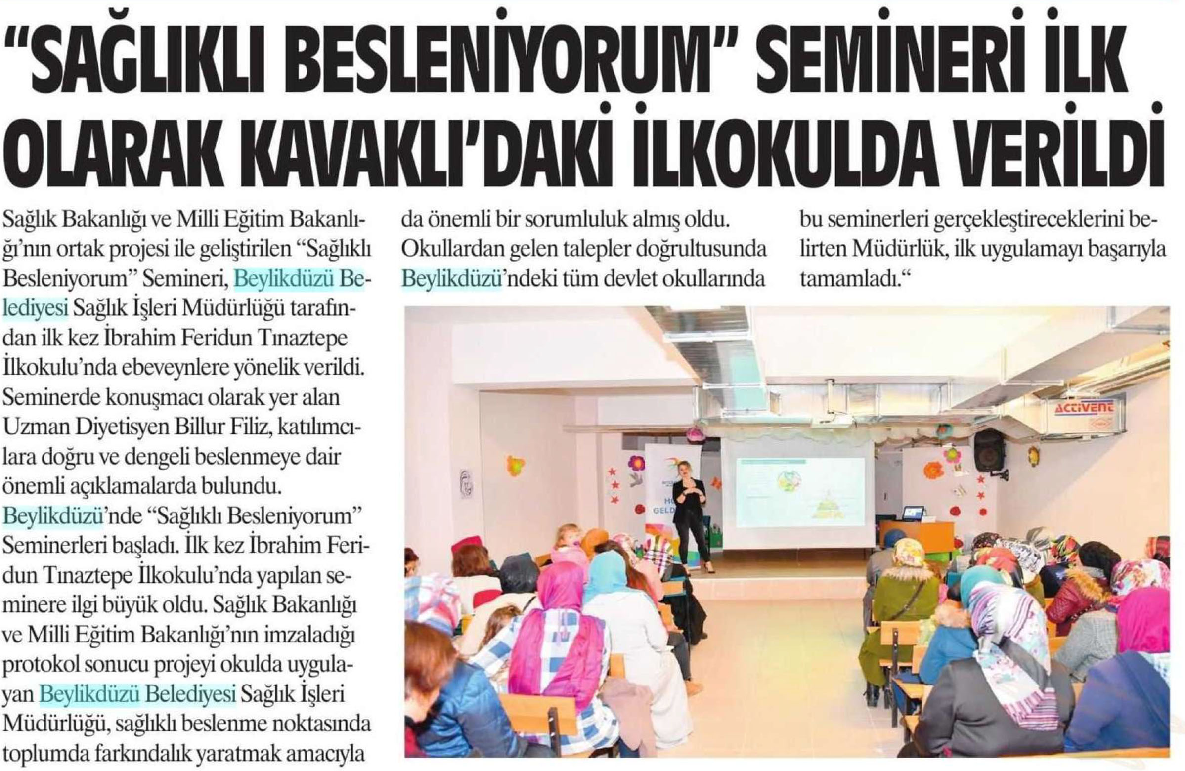 2 Mart 2018 tarihli "ZEYNA" gazetesi. Sağlık Bakanlığı ve Milli Eğitim Bakanlığı'nın ortak projesi ile geliştirilen "Sağlıklı Besleniyorum" Semineri, Beylikdüzü Belediyesi Sağlık İşleri Müdürlüğü tarafından ilk kez İbrahim Feridun Tınaztepe İlkokulu'nda ebeveynlere yönelik verildi.