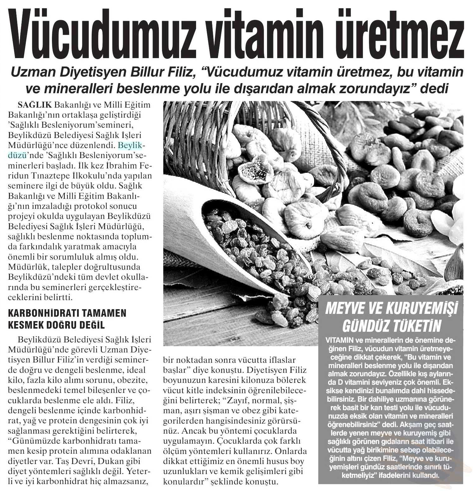 4 Mart 2018 tarihli "GÜNBOYU" gazetesi. Sağlık Bakanlığı ve Milli eğitim Bakanlığı'nın ortaklaşa geliştirdiği 'sağlıklı Besleniyorum' semineri, Beylikdüzü Belediyesi Sağlık İşleri Müdürlüğü'nce düzenlendi. İlk kez Feridun Tınaztepe İlkokulu'nda yapılan seminere ilgi de büyük oldu. Uzman Diyetisyen Billur Filiz, "Vücudumuz vitamin üretmez, bu vitamin ve mineralleri beslenme yolu ile dışarıdan almak zorundayız" dedi.