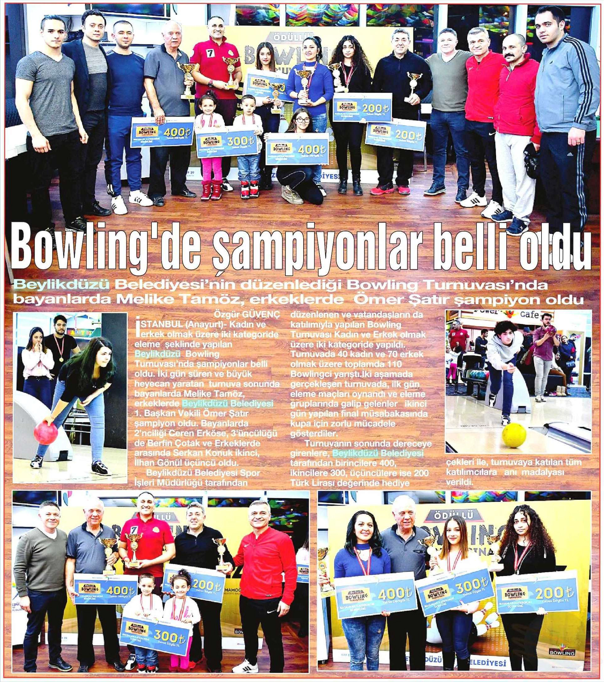 5 Mart 2018 tarihli "ANAYURT" gazetesi. Beylikdüzü Belediyesi'nin düzenlediği Bowling Turnuvası'nda şampiyonlar ödüllerine kavuştu. Kadın ve erkek olmak üzere iki ayrı kategoride yapılan turnuvada, ilk üçe girmeye hak kazanan isimlere hediye çeki verildi. Bayanlarda Melike Tamöz, erkeklerde Ömer Şatır şampiyon oldu.