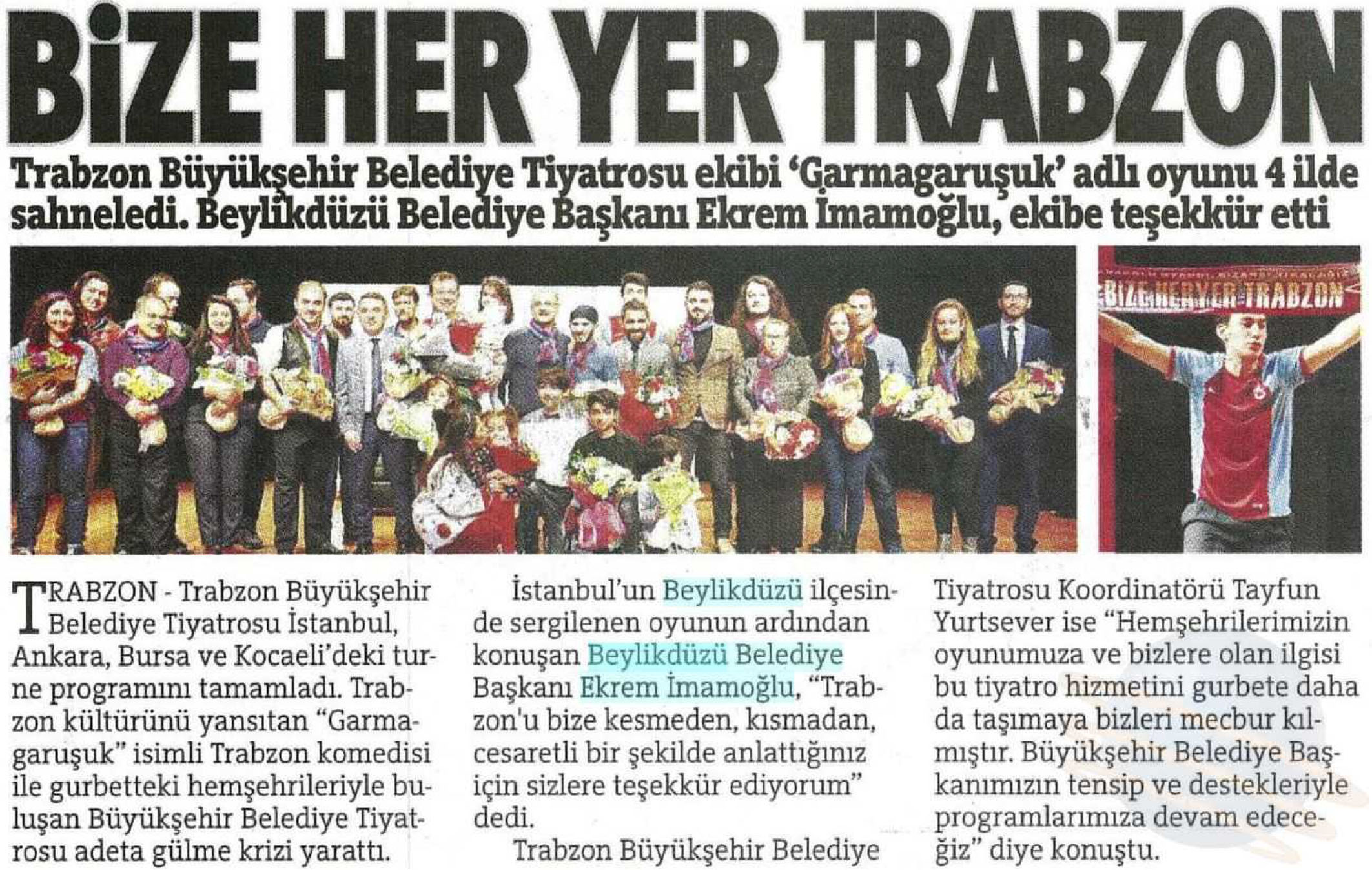 5 Mart 2018 tarihli "KARADENİZ" gazetesi. Trabzon Büyükşehir Belediye Tiyatrosu ekibi "Garmagaruşuk" adlı oyunu 4 ilde sahneledi. İstanbul'un Beylikdüzü ilçesinde sergilenen oyunun ardından konuşan Beylikdüzü Belediye Başkanı Ekrem İmamoğlu, "Trabzon'u bize kesmeden,kısmadan cesaretli bir şekilde anlattığınız için sizlere teşekkür ediyorum" dedi.
