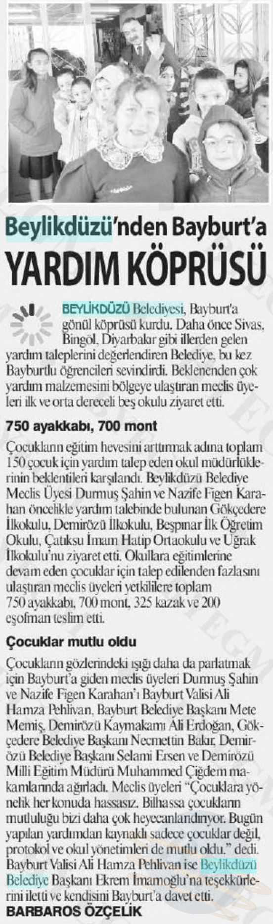 6 Mart 2018 tarihli "DAMGA" gazetesi. Beylikdüzü Belediyesi, Bayburt'a gönül köprüsü kurdu. Daha önce Sivas, Bingöl, Diyarbakır gibi illerden gelen yardım taleplerini değerlendiren Belediye, bu kez Bayburtlu öğrencileri sevindirdi. Beylikdüzü Belediye Meclis Üyesi Durmuş Şahin ve Nazife Figen Karahan Gökçedere, Demiröz, Beşpınar, Uğrak ilkokullarıyla Çatıksu İmam Hatip Ortaokulu'nu ziyaret etti ve 750 ayakabbı, 700 mont, 325 kazak ve 200 eşofman teslim etti.