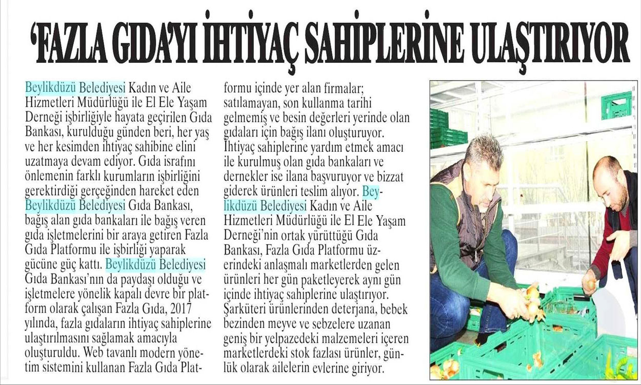 7 Mart 2018 tarihli "NABIZ" gazetesi. Beylikdüzü Belediyesi Kadın ve Aile Hizmetleri Müdürlüğü ile El Ele Yaşam Derneği iş birliğiyle hayata geçirilen Gıda Bankası kurulduğu günden beri, her yaş ve her kesimden ihtiyaç sahibine elini uzatmaya devam ediyor.