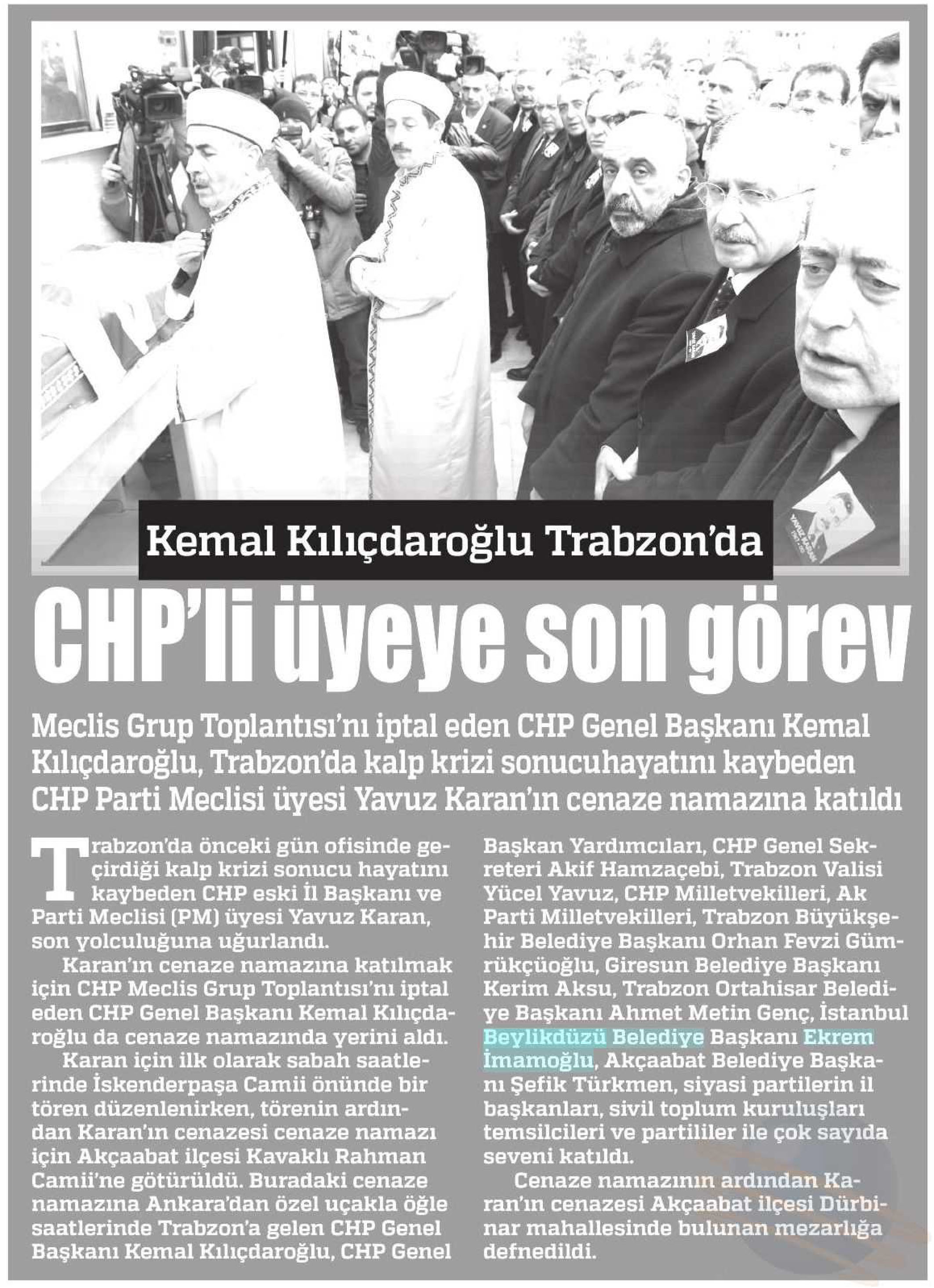 7 Mart 2018 tarihli "SAMSUN" gazetesi. Meclis Grup Toplantısını iptal eden CHP Genel Başkanı Kemal Kılıçdaroğlu, Trabzon'da kalp krizi sonucu hayatını kayneden CHP Parti Meclisi üyesi Yavuz Karan'ın cenaze namazına katıldı. CHP Meclis üyesinin cenazesine, CHP ve AKP milletvekilleri, Beylikdüzü Belediye Başkanuı Ekrem İmamoğlu, sivil toplum kuruluşu temsilcileri, partililer ve çok sayıda seveni katıldı. Trabzon İskenderpaşa Camiinde kılınan cenaze namazının ardından Karan'ın cenazesi, Akçaabat ilçesi Dürbınar mahallesinde bulunan mezarlığa defnedildi.