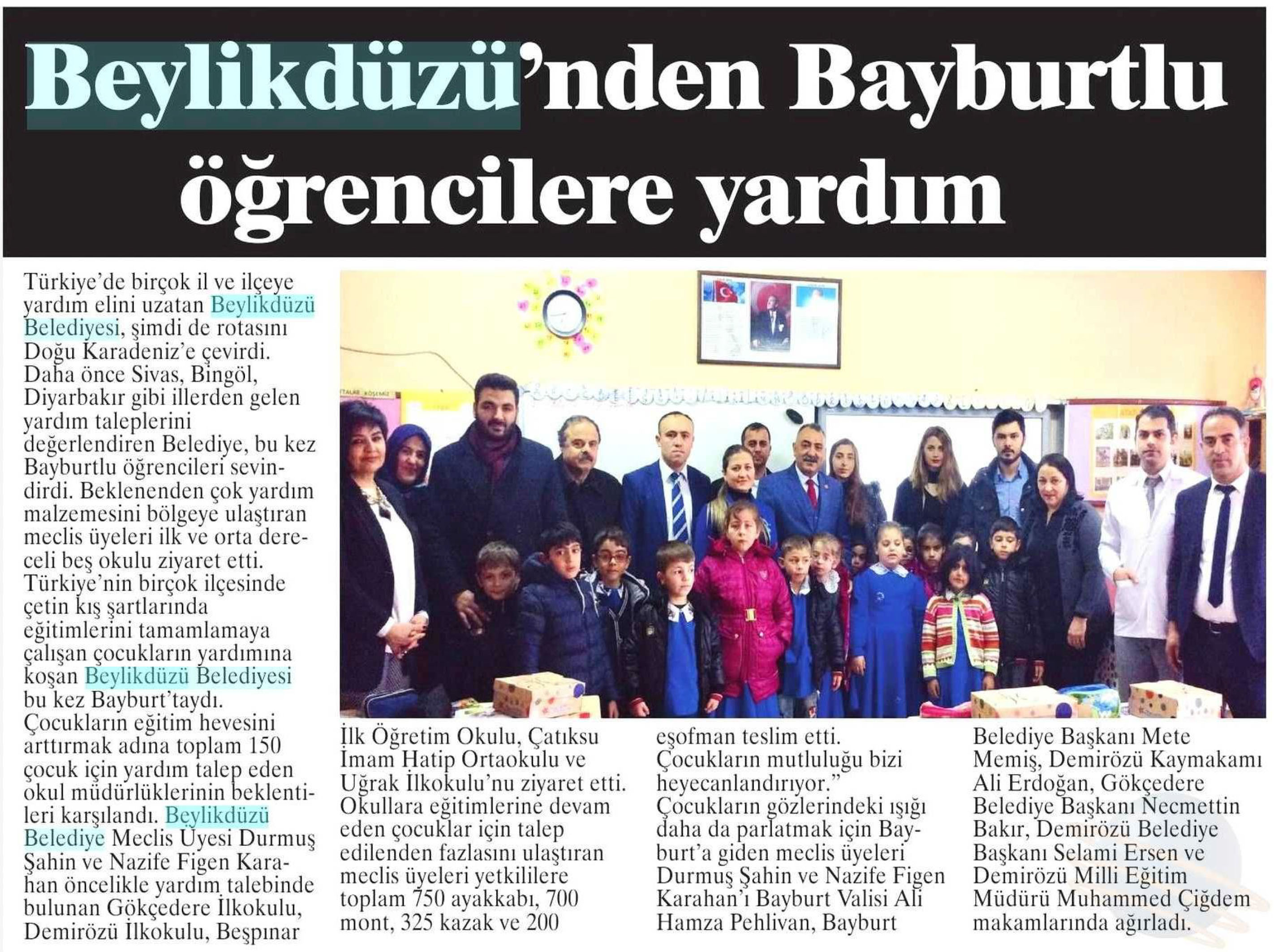 7 Mart 2018 tarihli "NABIZ" gazetesi. Türkiye'de birçok il ve ilçeye yardım elini uzatan Beylikdüzü Belediyesi bu kez Bayburtlu öğrencileri sevindirdi. Türkiye'nin birçok ilçesinde çetin kış şartlarından eğitimlerini tamamlamaya çalışan çoçuklarına yardımına koşan Beylikdüzü Belediyesi bu kez Bayburt'taydı. Beylikdüzü Belediye Meclis Üyesi Durmuş Şahin ve Nazife Figen Karahan Gökçedere, Demiröz, Beşpınar, Uğrak ilkokullarıyla Çatıksu İmam Hatip Ortaokulu'nu ziyaret etti ve 750 ayakkabı, 700 mont, 325 kazak ve 200 eşofman teslim etti.