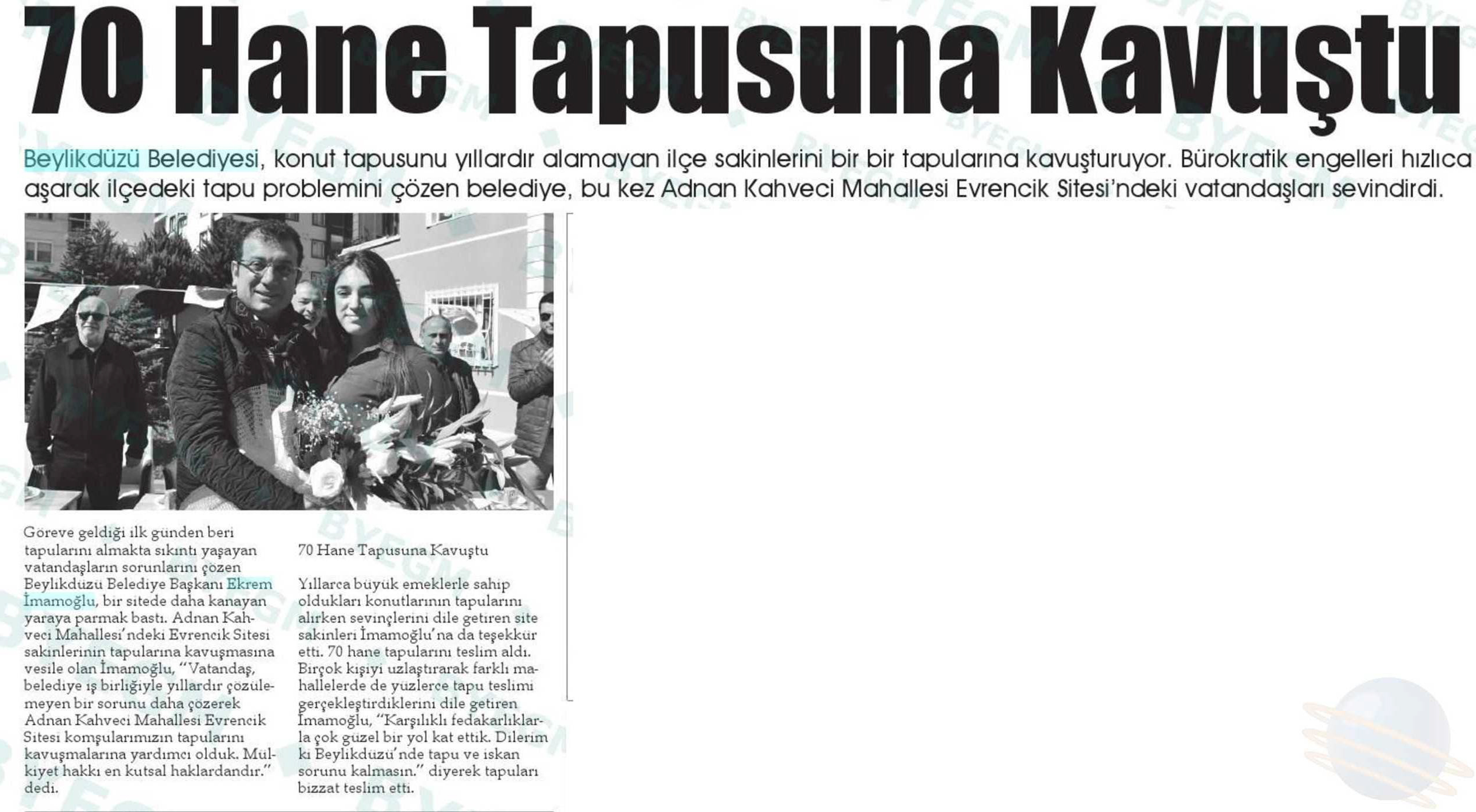 20 Mart 2018 tarihli " İKTİDAR" gazetesi. Beylikdüzü Belediyesi, konut tapusunu yıllardır alamayan ilçe sakinlerini bir bir tapularına kavuşturuyor. Bürokratik engelleri hızlıca aşarak ilçedeki tapu problemini çözen belediye, bu kez Adnan Kahveci Mahallesi Evrencik Sitesi'ndeki vatandaşları sevindirdi.