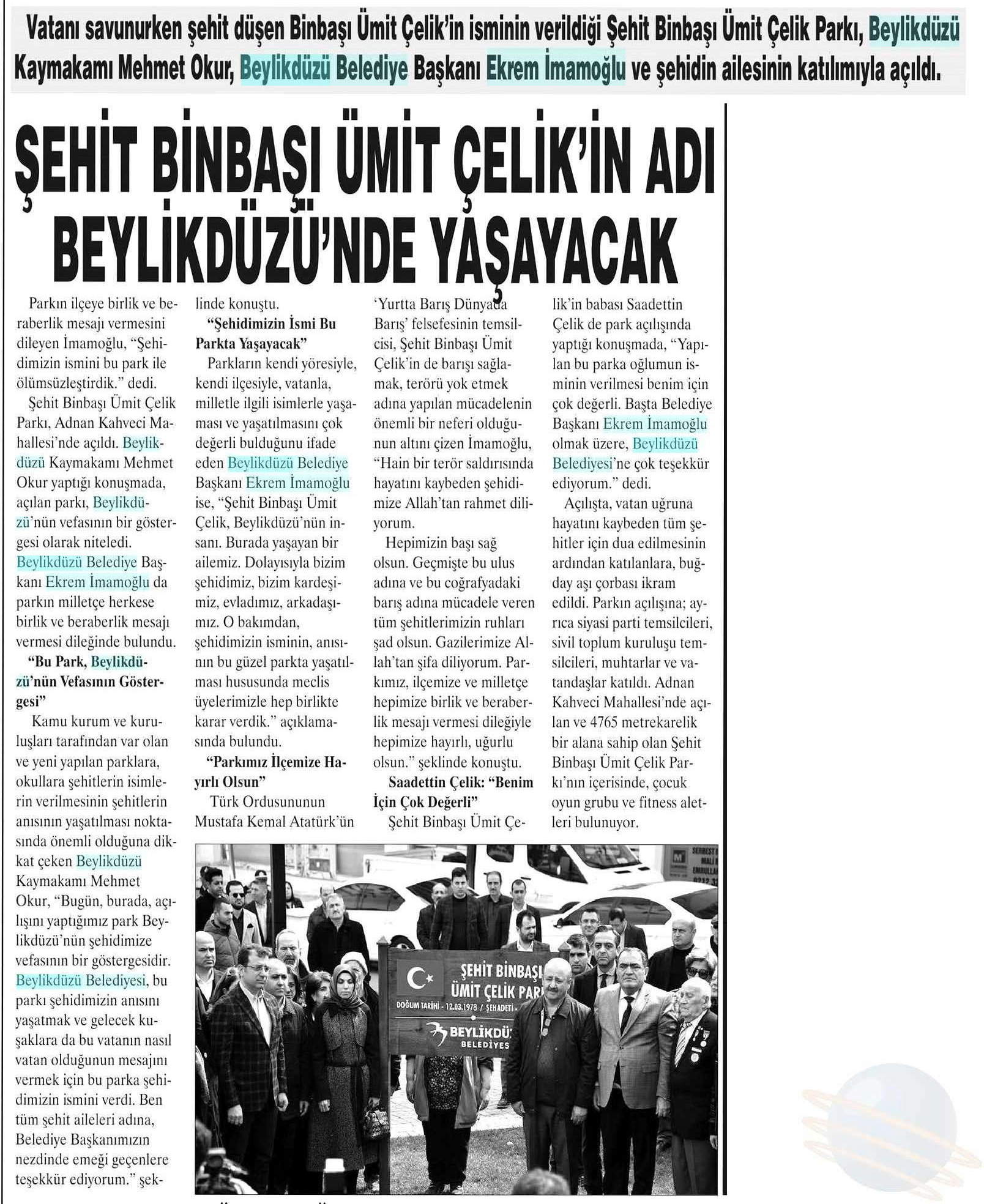 26 Mart 2018 tarihli "YURT HABER" gazetesi. Vatanı savunurken şehit düşen Ümit Çelik'in isminin verildiği Şehit Binbaşı Ümit Çelik Parkı, Beylikdüzü Kaymakamı Mehmet Okur, Beylikdüzü Belediye Başkanı Ekrem İmamoğlu ve şehidin ailesinin katılımıyla açıldı.