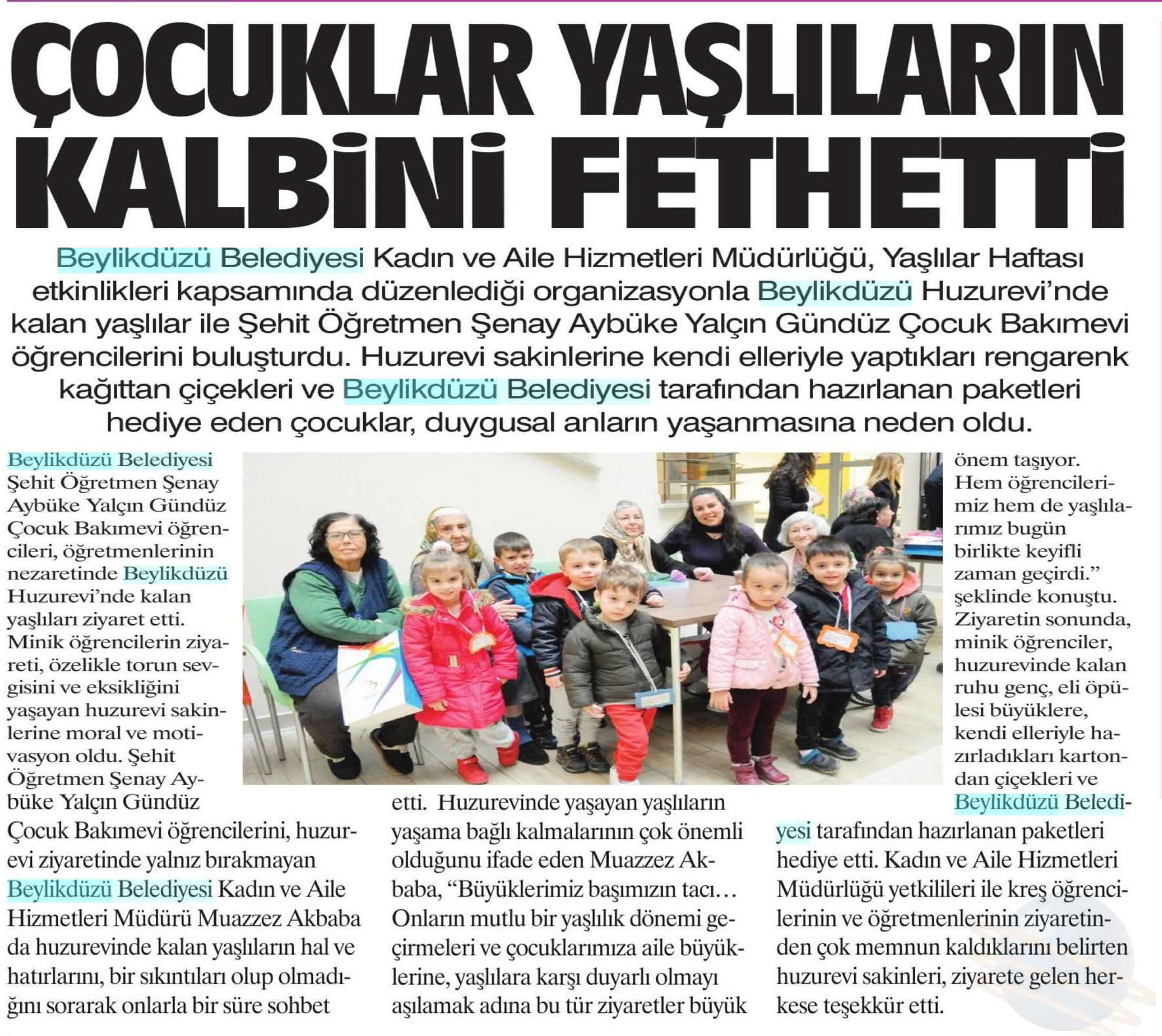 29 Mart 2018 tarihli "ZEYNA" gazetesi. Beylikdüzü Belediyesi Kadın ve Aile Hizmetleri Müdürlüğü, Yaşlılar Haftası etkinlikleri kapsamında düzenlediği organizasyonla Beylikdüzü Huzurevi'nde kalan yaşlılar ile Şehit Öğretmen Şenay Aybüke Yalçın Gündüz Çocuk Bakımevi öğrencilerini buluşturdu.